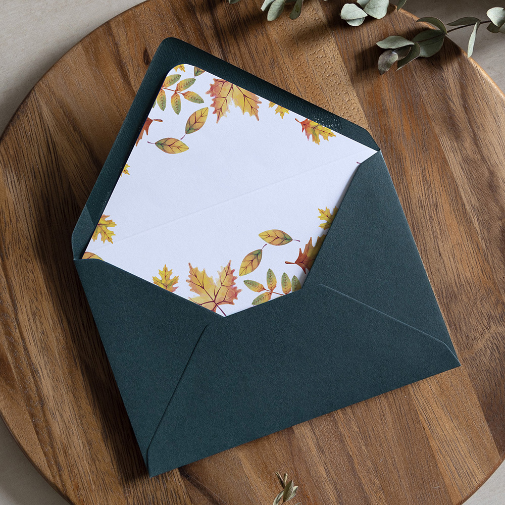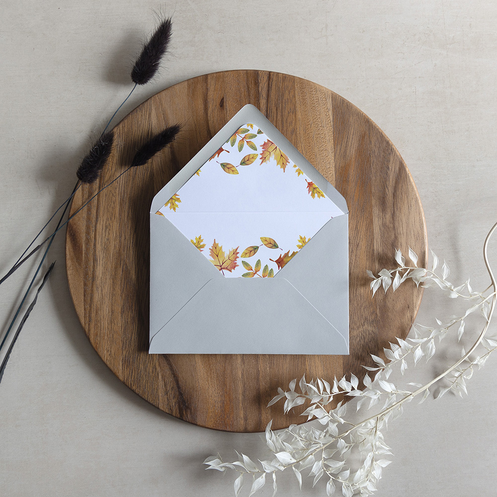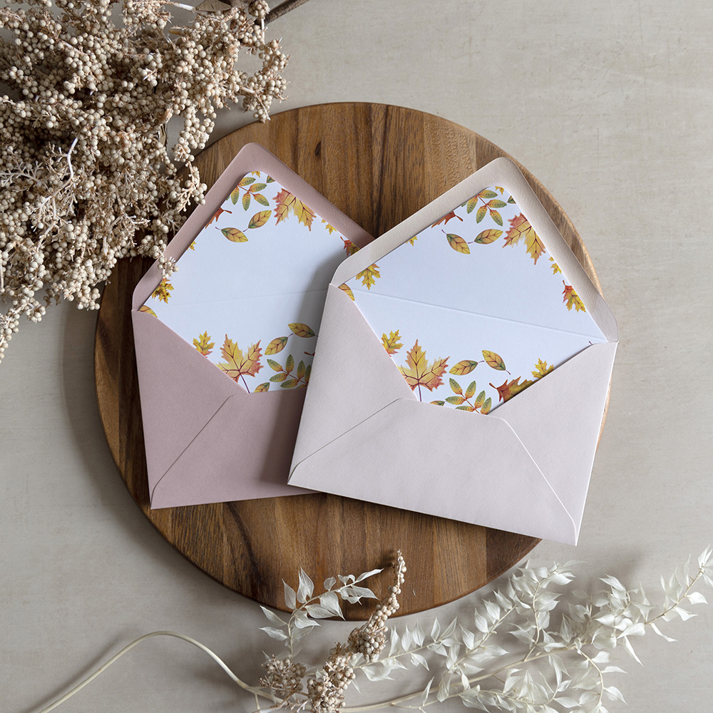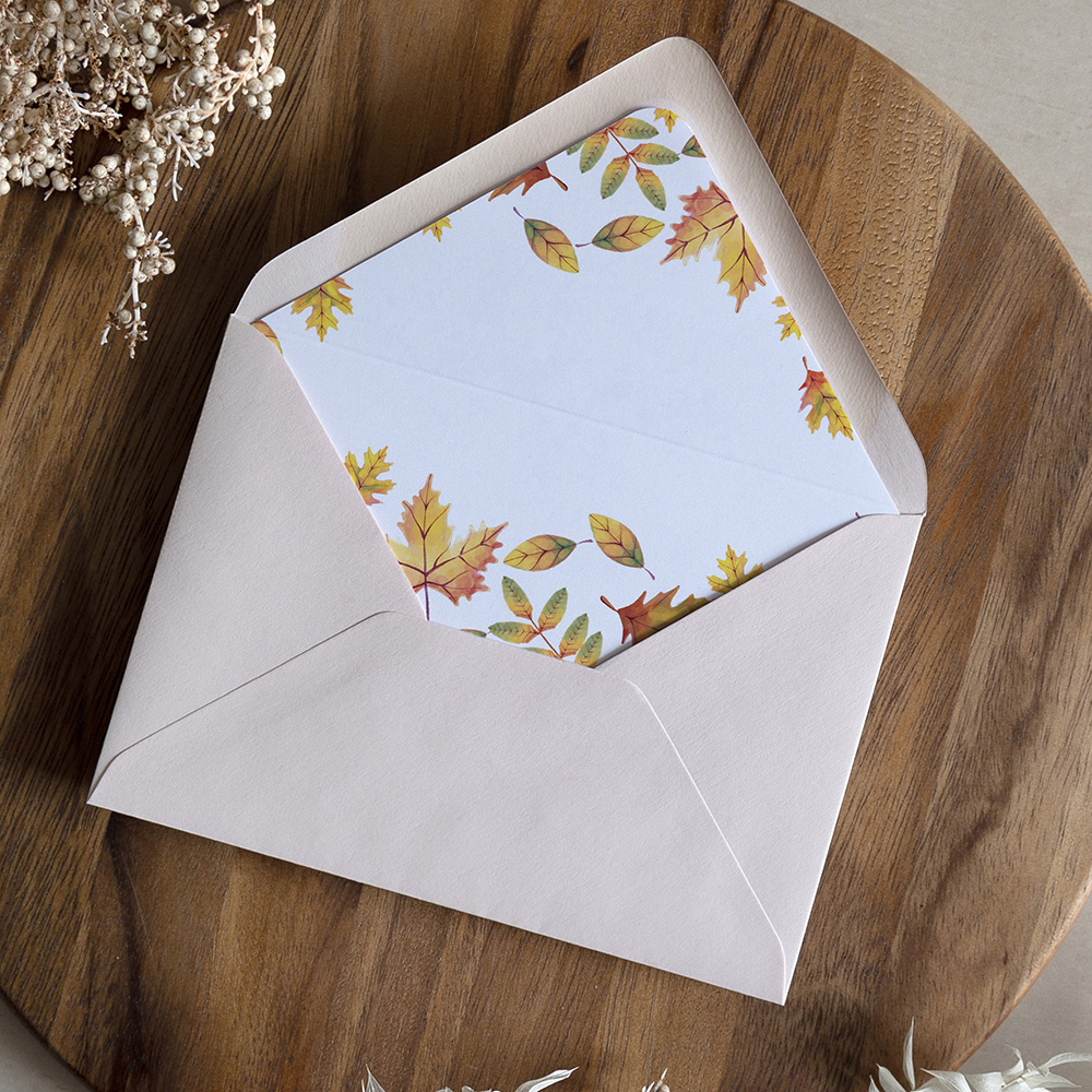 Warm autumn leaves in shades of copper and rust frame the top edge of the Dorothy liner. The design’s gentle fall from the upper corners creates a natural cascade, making it a perfect fit for autumn weddings or stationery with a seasonal, rustic tone.