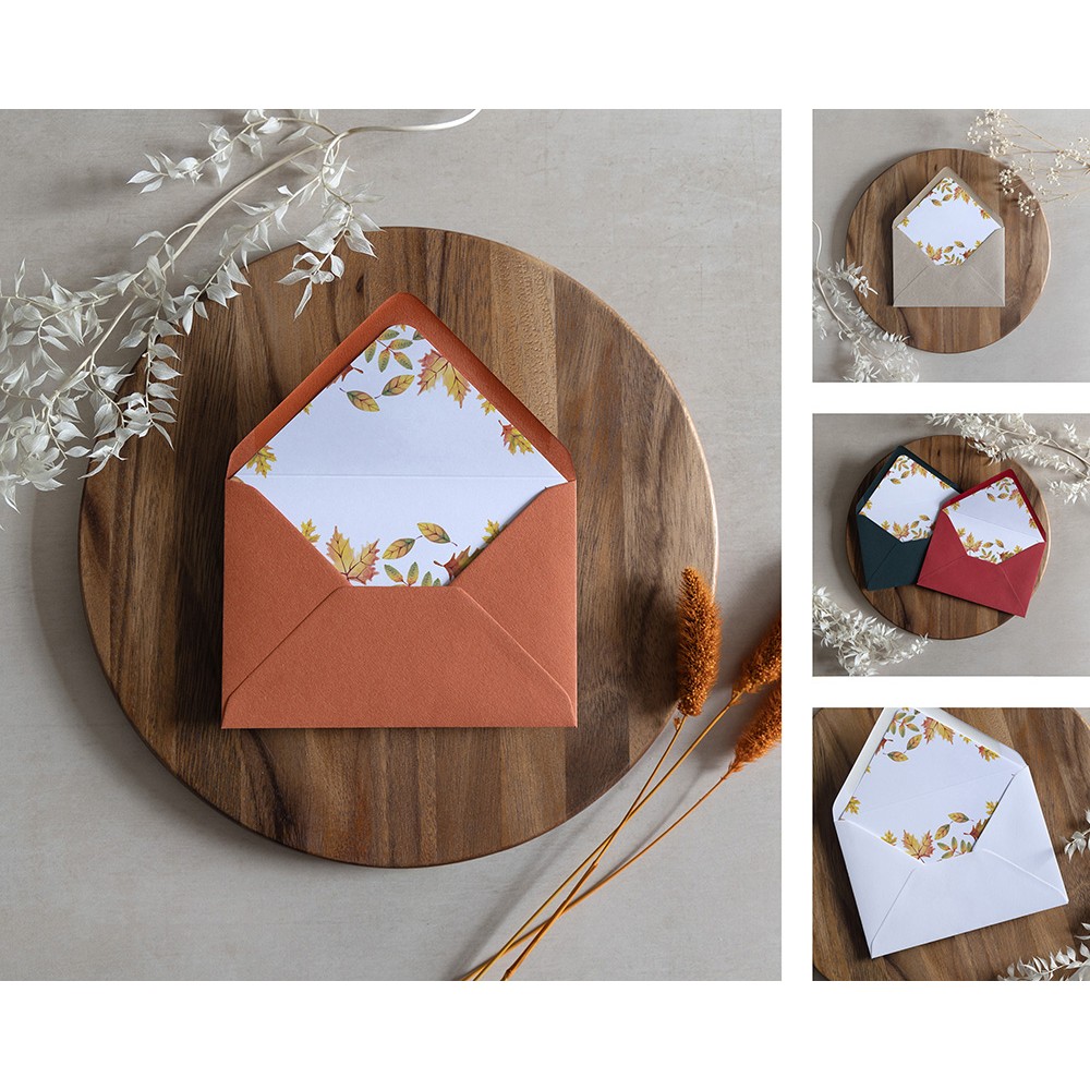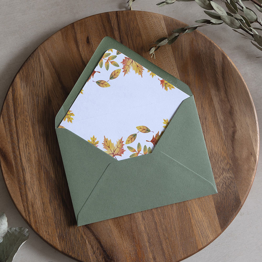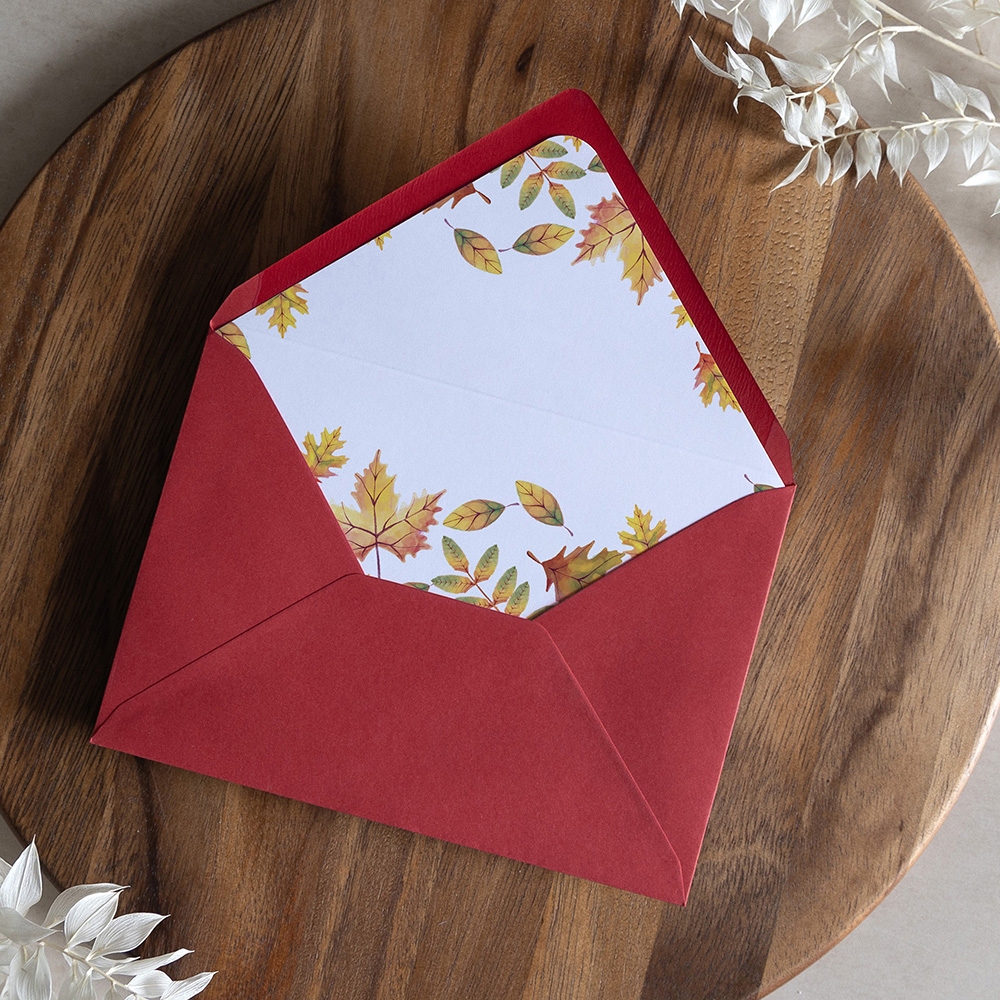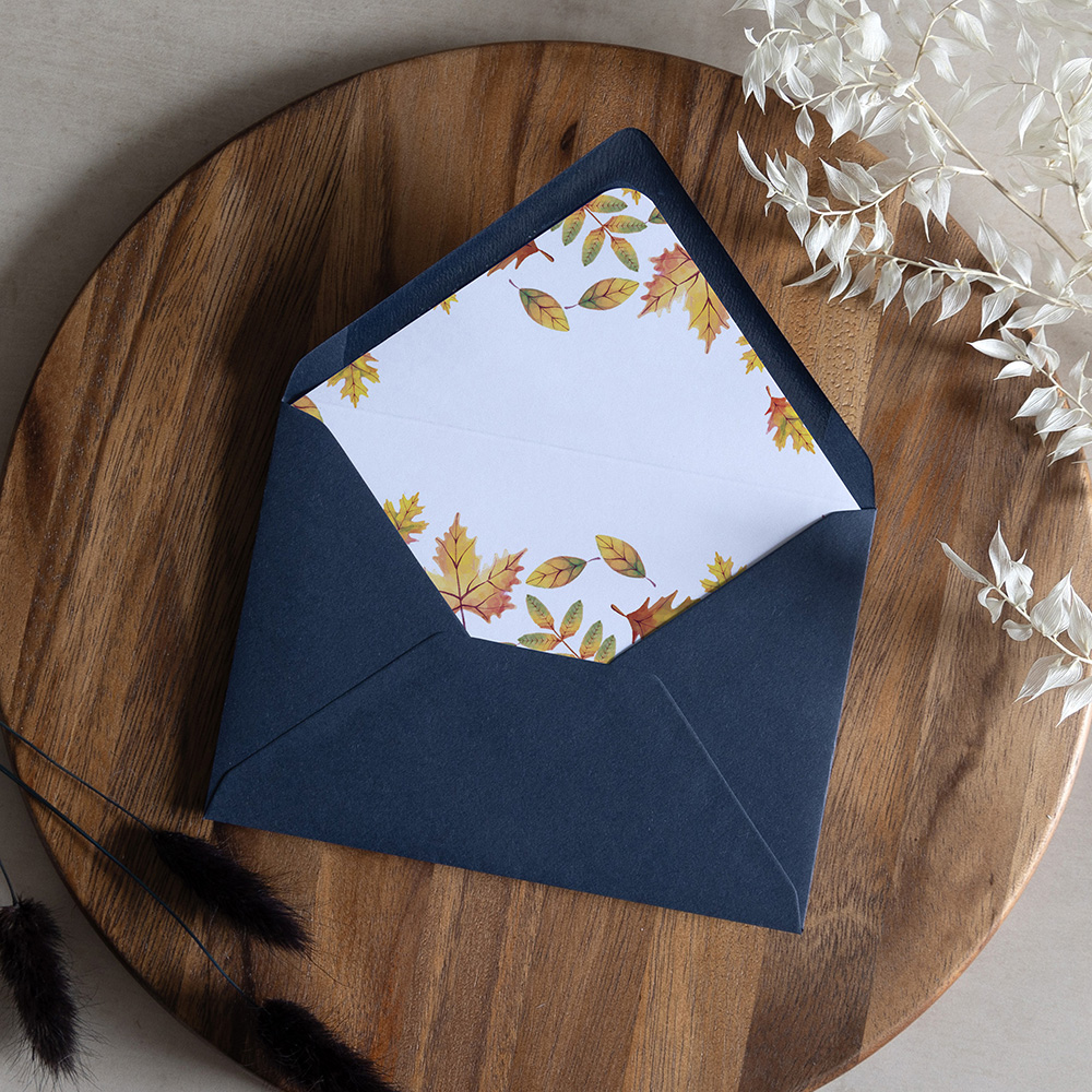 Warm autumn leaves in shades of copper and rust frame the top edge of the Dorothy liner. The design’s gentle fall from the upper corners creates a natural cascade, making it a perfect fit for autumn weddings or stationery with a seasonal, rustic tone.