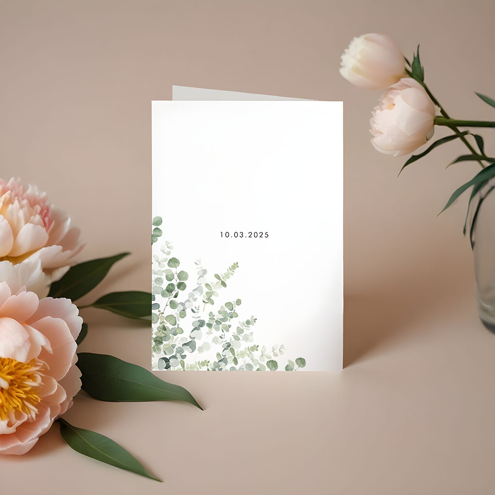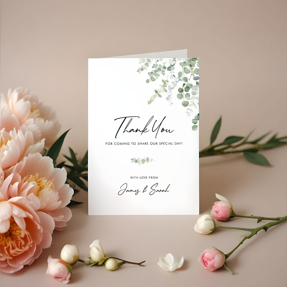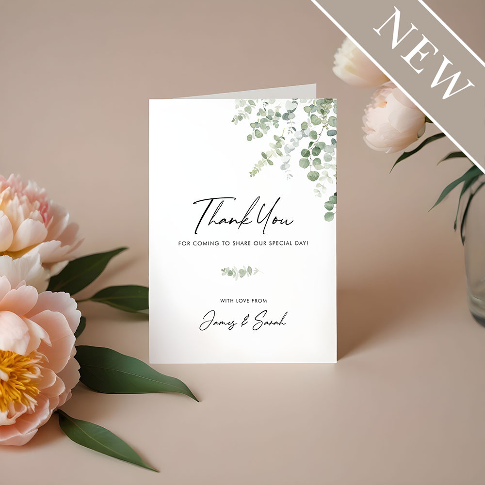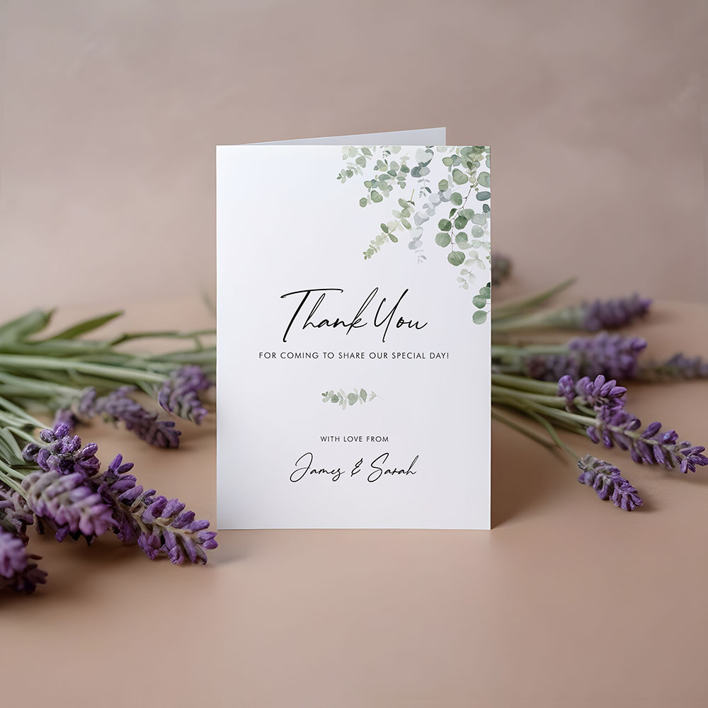 Our 'Classic Eucalyptus' folded thank you card features a timeless design with delicate eucalyptus leaves in soft, natural tones. It’s the perfect way to send a heartfelt message of thanks to your guests, capturing the fresh, organic feel of your wedding day.