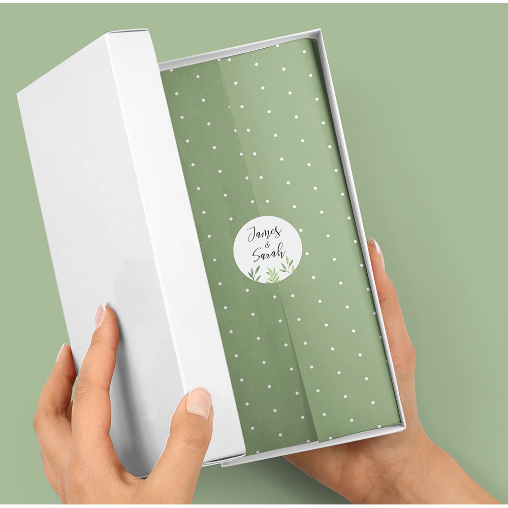 LARGE ROUND STICKERS – Large stickers are 43mm in diameter and come in either gloss/matt white. There are 24 on a sheet. They are fully customisable so feel free to refer to one of our other stationery items for design and/or font.