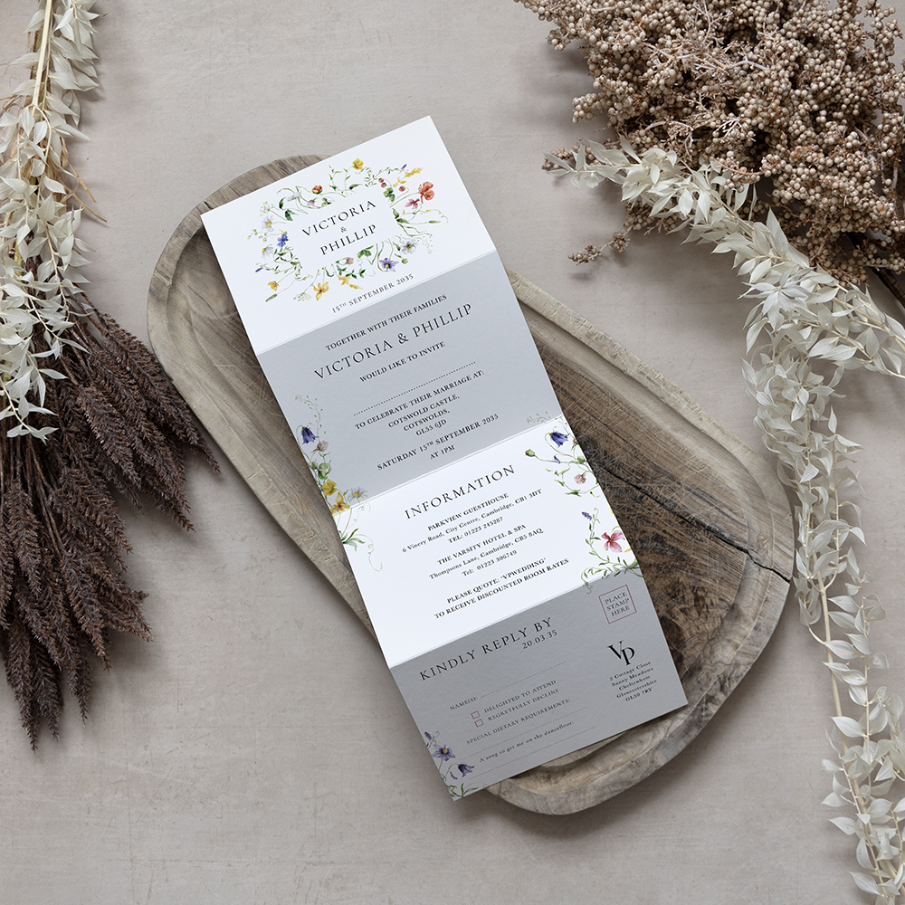 Our folded wedding invitations keep all your information together in one place and are fully customised for you for the perfect finish. We want you to be excited to send them out to your guests. Vintage, modern, floral, delicate, bold, plain, we've got wedding stationery to suit everyone's style. Perfect no matter what time of year you are getting married. Optional personalised stickers and envelope liners give them another personal touch. We are careful to select only the best quality card so that we can create something for you and your guests to hold and cherish forever. We can create the rest of your stationery to match your chosen design or change these to match one of our other designs.