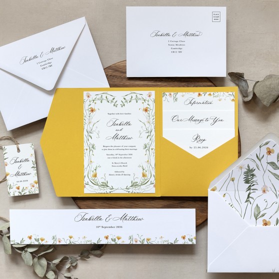 Our Golden Meadow sleeve invitation set features a charming botanical design inspired by wildflower meadows in bloom. Delicate yellow and peach florals trail across each card, creating a warm and romantic feel for your wedding stationery. The coordinating bellyband wraps neatly around the invite and inserts, giving the full set a polished, layered look. Each pack includes your main invitation and your choice of matching cards, making it a practical and beautifully cohesive choice for your guests.
