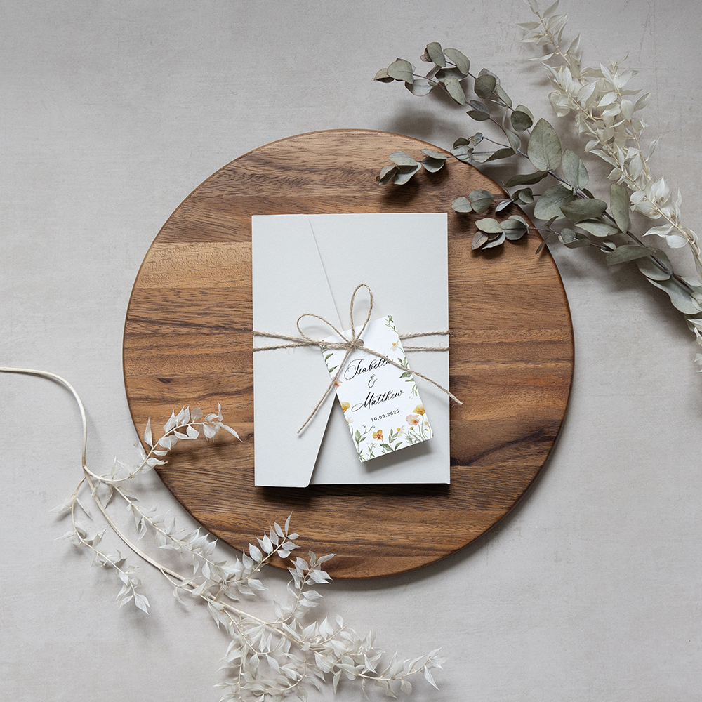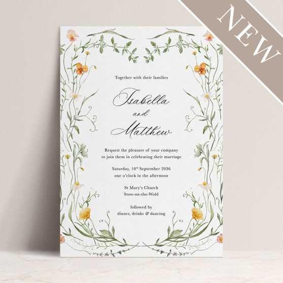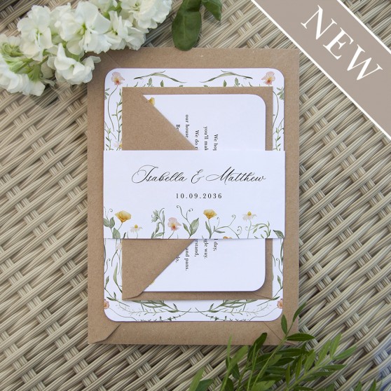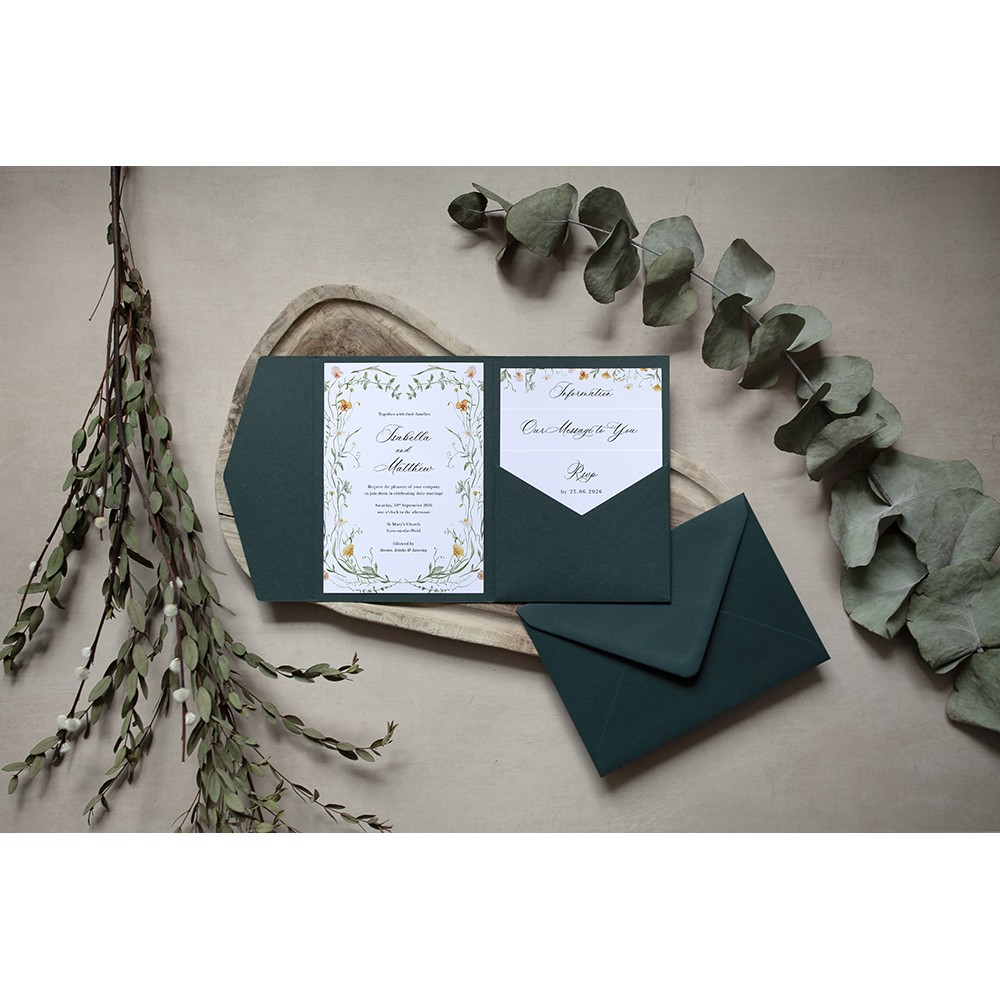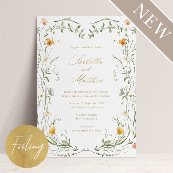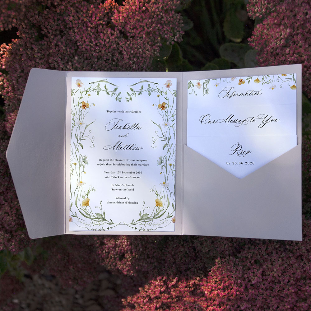 Our Golden Meadow Pocketfold Wedding Invitation is filled with delicate hand-drawn florals, inspired by wild meadows in bloom. Soft botanical illustrations frame your details with charm and lightness, while elegant script typography brings a romantic, natural feel to the design. The pocketfold layout keeps your RSVP, guest information and other inserts neatly organised for a thoughtful, polished presentation. Perfect for countryside, boho or garden weddings.