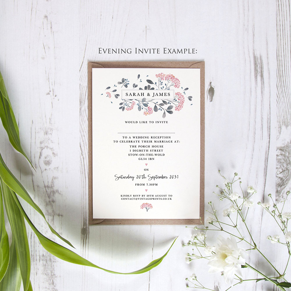 It can be difficult to choose your stationery with so many different options available. Ordering a sample is a great way to show you the quality, colours, and style so that you can make up your mind. These invites are printed on thick 330gsm smooth white or ivory card stock or on 350gsm Premium Cream lightly textured card. Envelope Liners are printed on a smooth quality white or ivory paper. We offer 3 different types of samples from a simple generic sample through to a fully personalised, printed sample.