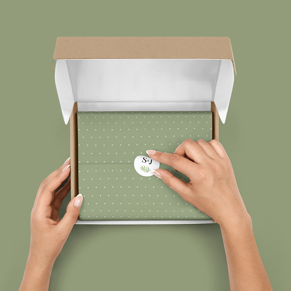 LARGE ROUND STICKERS – Large stickers are 43mm in diameter and come in either gloss/matt white. There are 24 on a sheet. They are fully customisable so feel free to refer to one of our other stationery items for design and/or font.