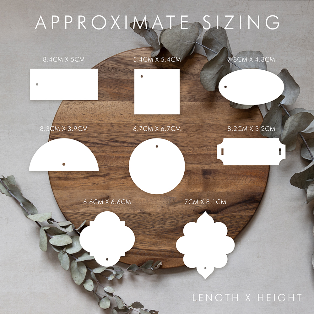 AVAILABLE OPTIONS EXPLAINED Tag Shape Choose from a selection of our signature tag shapes, each designed to pair beautifully with your chosen style. If you’d like something unique, we can also create a custom shape just for you (maximum finished size 8.4cm x 7cm). Larger tags may incur an additional charge.
