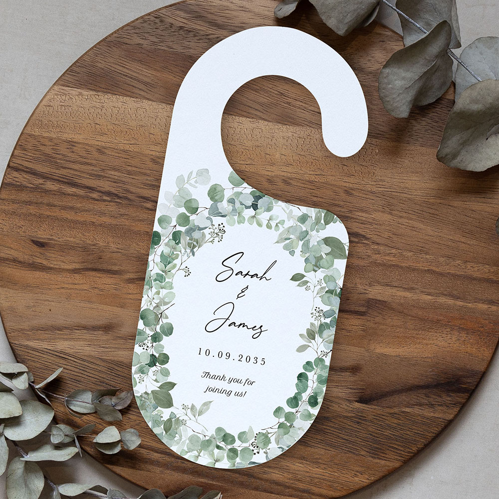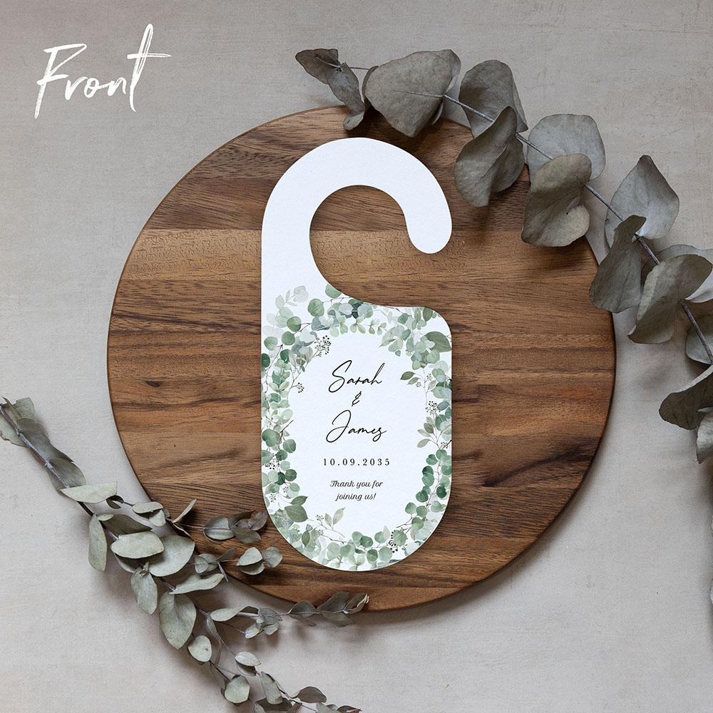 Our Classic Eucalyptus CE21 wedding door hangers are the perfect finishing touch for your big day. This design features a delicate eucalyptus wreath in soft green watercolour tones, creating a calm and natural look ideal for elegant, rustic, or botanical weddings. With space to personalise with your names and wedding date, they add both charm and practicality to your wedding weekend.