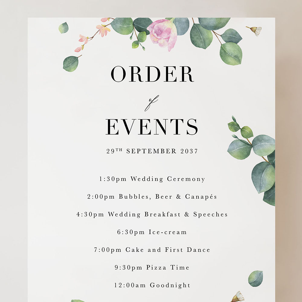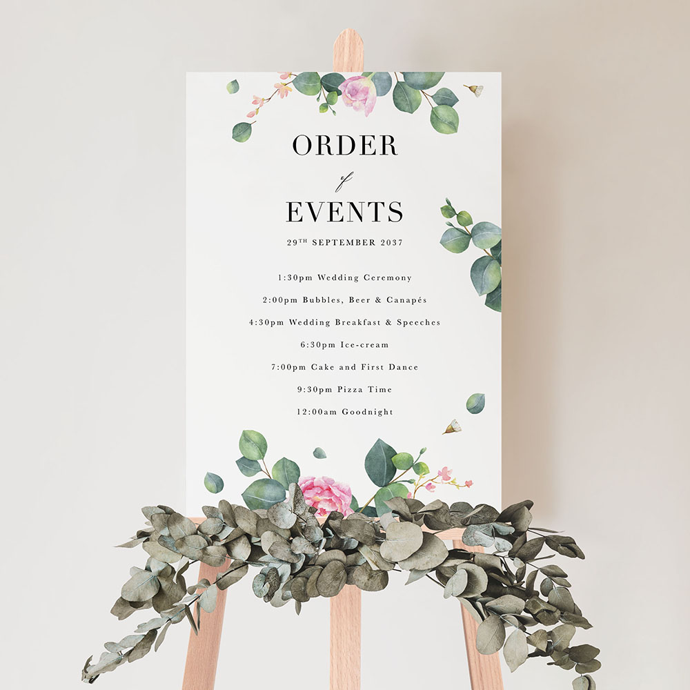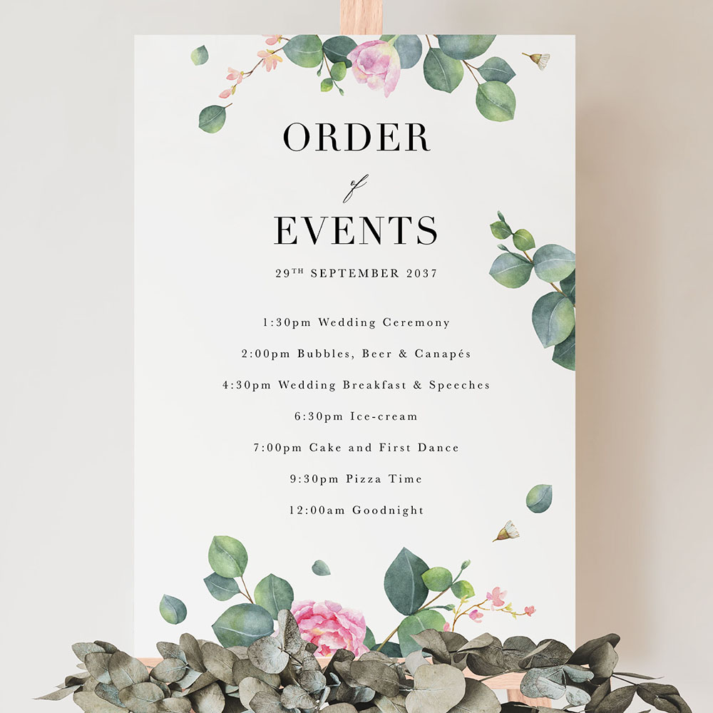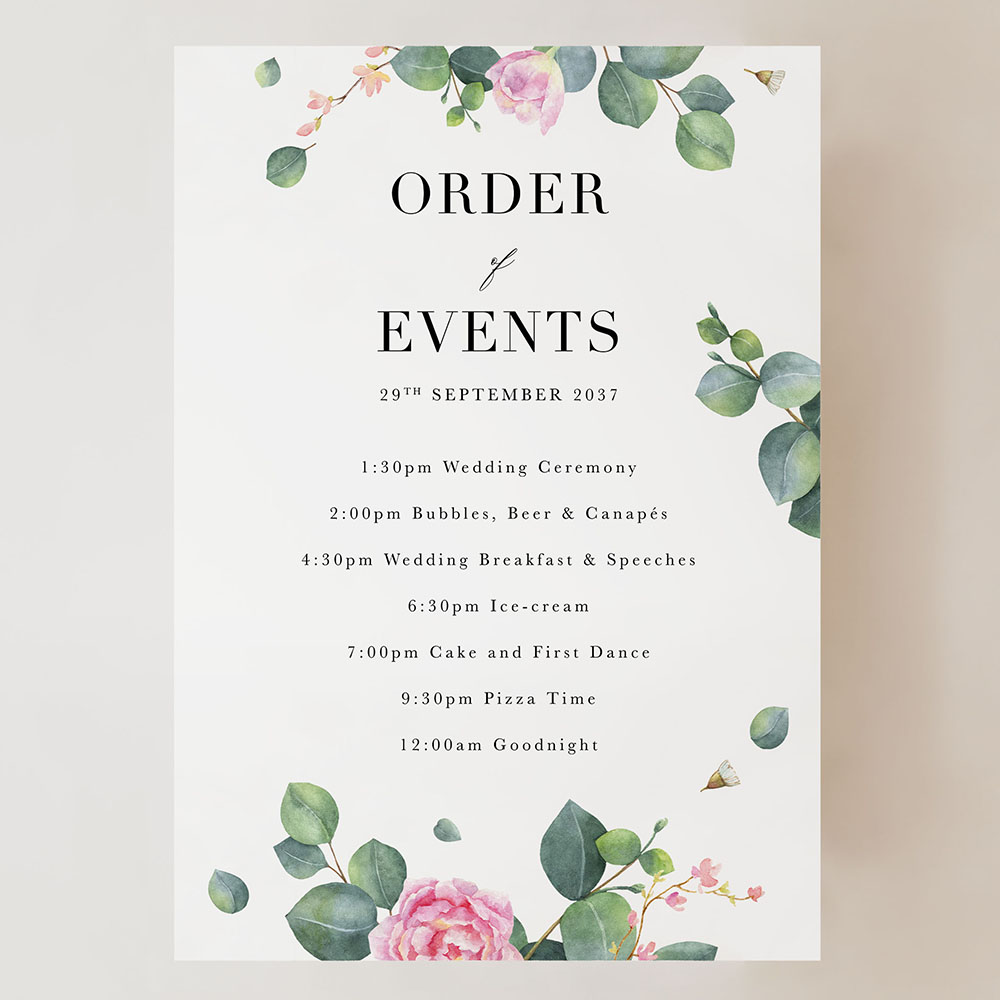 Our Eucalyptus Blush Order of Events Sign features soft eucalyptus leaves and pink florals framing a clean portrait layout. With classic serif fonts and a delicate touch of greenery, this design is ideal for romantic, elegant or garden-inspired weddings. Printed onto your choice of durable Foamex board or card and available in A2, A1 or A0 sizes. Fonts and layout can be tailored to suit your day—just leave a note or get in touch with your custom request.