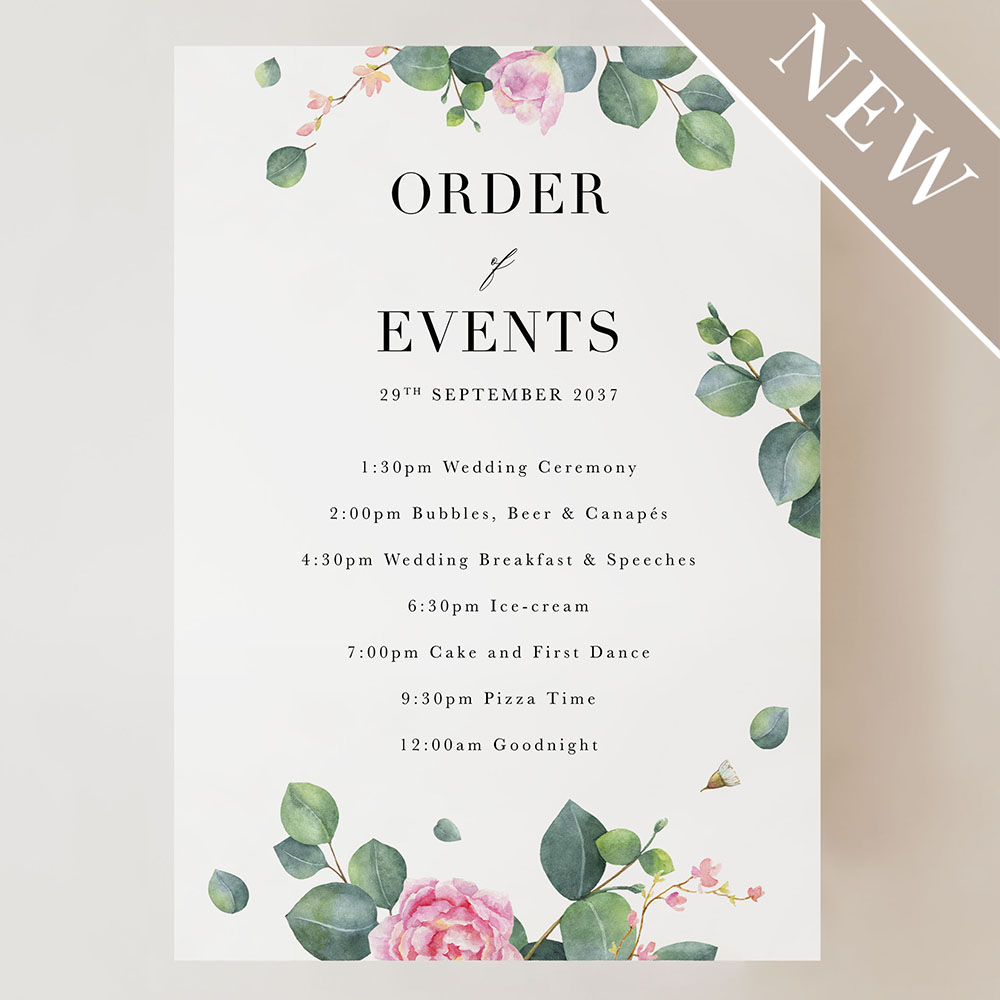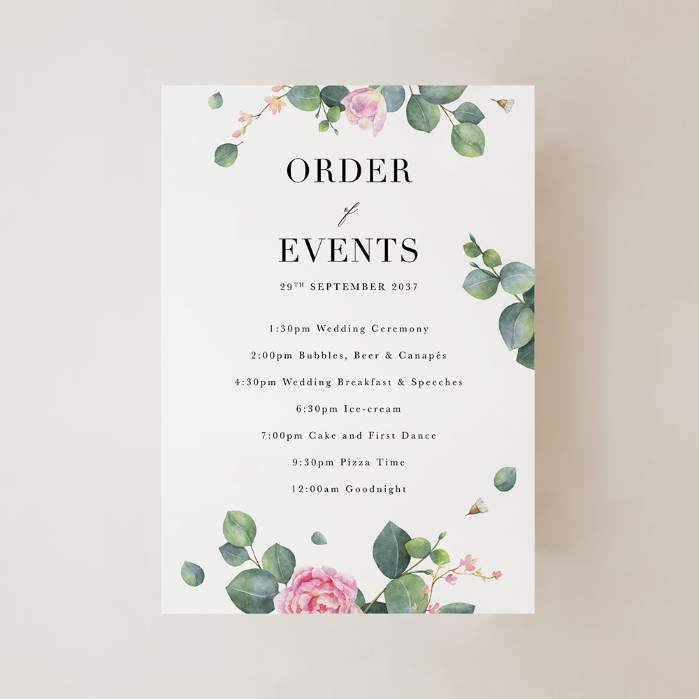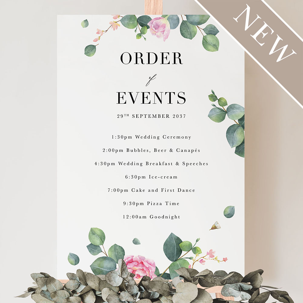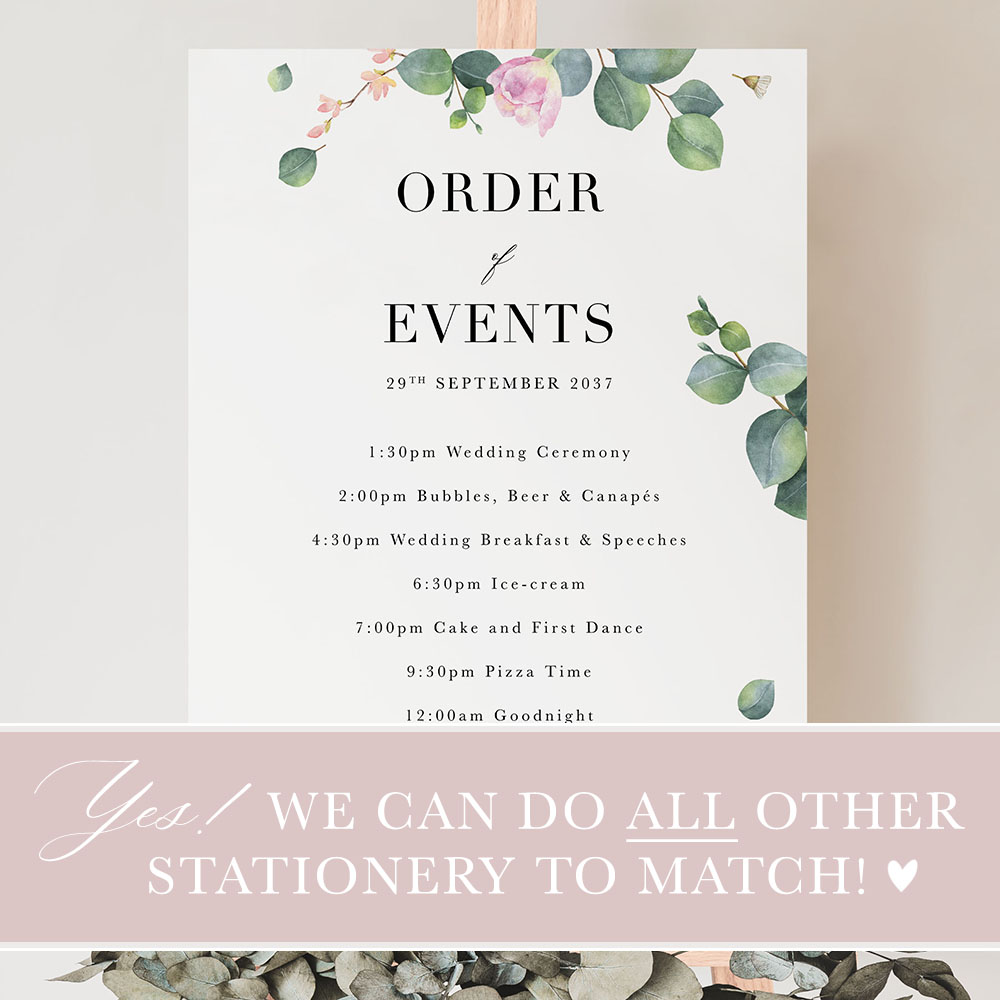 Our Eucalyptus Blush Order of Events Sign features soft eucalyptus leaves and pink florals framing a clean portrait layout. With classic serif fonts and a delicate touch of greenery, this design is ideal for romantic, elegant or garden-inspired weddings. Printed onto your choice of durable Foamex board or card and available in A2, A1 or A0 sizes. Fonts and layout can be tailored to suit your day—just leave a note or get in touch with your custom request.
