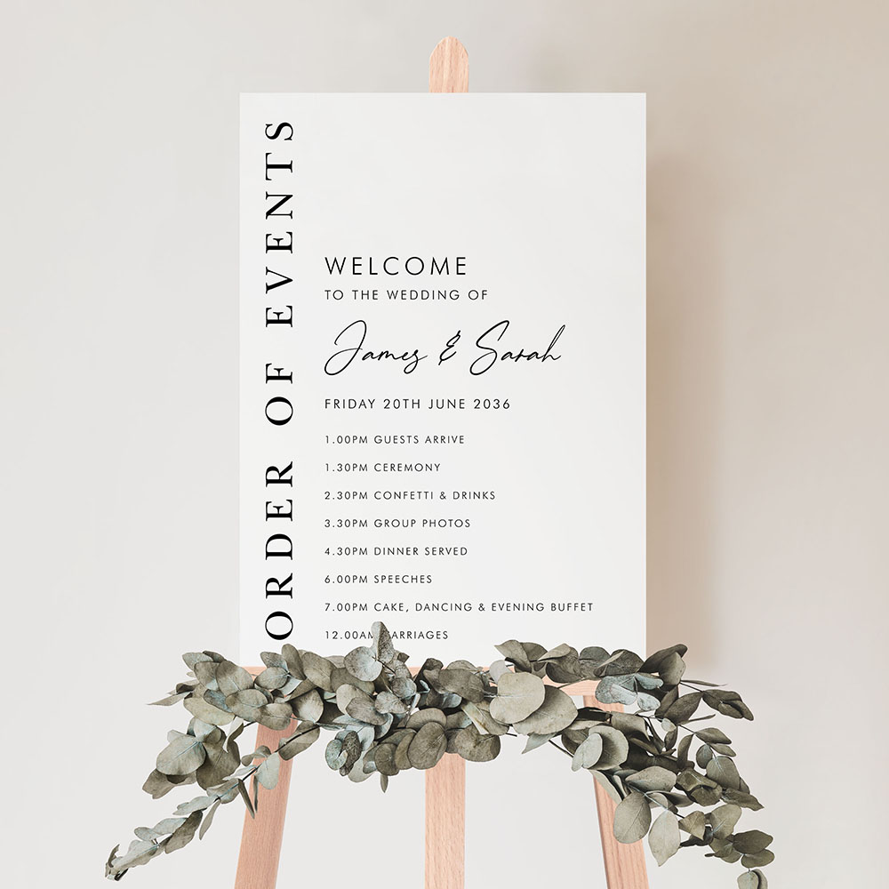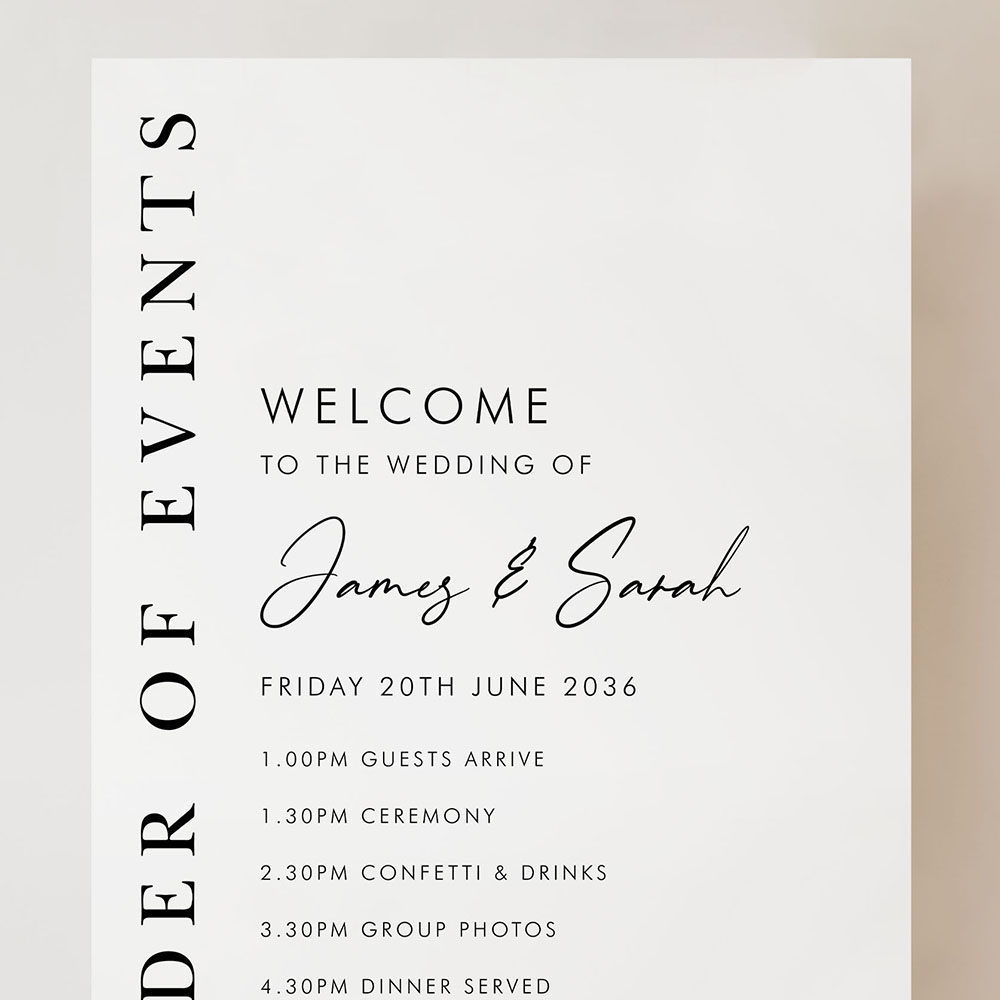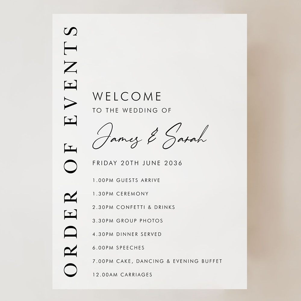 Our Matthew Portrait Order of Events Sign combines vertical serif lettering with a modern layout to create a clean, sophisticated welcome. Featuring your timeline details alongside a bold “Order of Events” column, this design is ideal for elegant and contemporary weddings. Printed onto your choice of durable Foamex board or card and available in A2, A1 or A0 sizes. Fonts and layout can be tailored to suit your day—just leave a note or get in touch with your custom request.