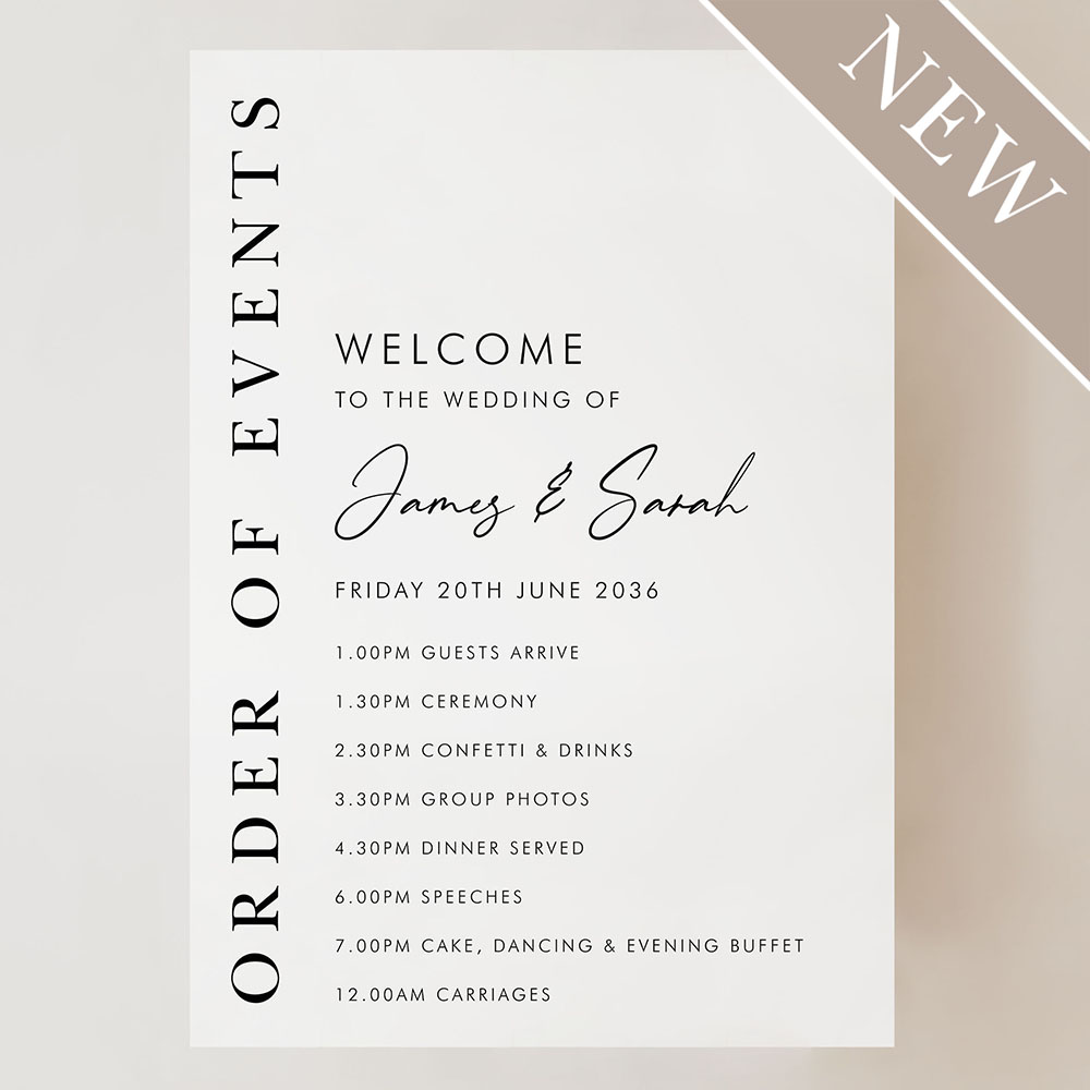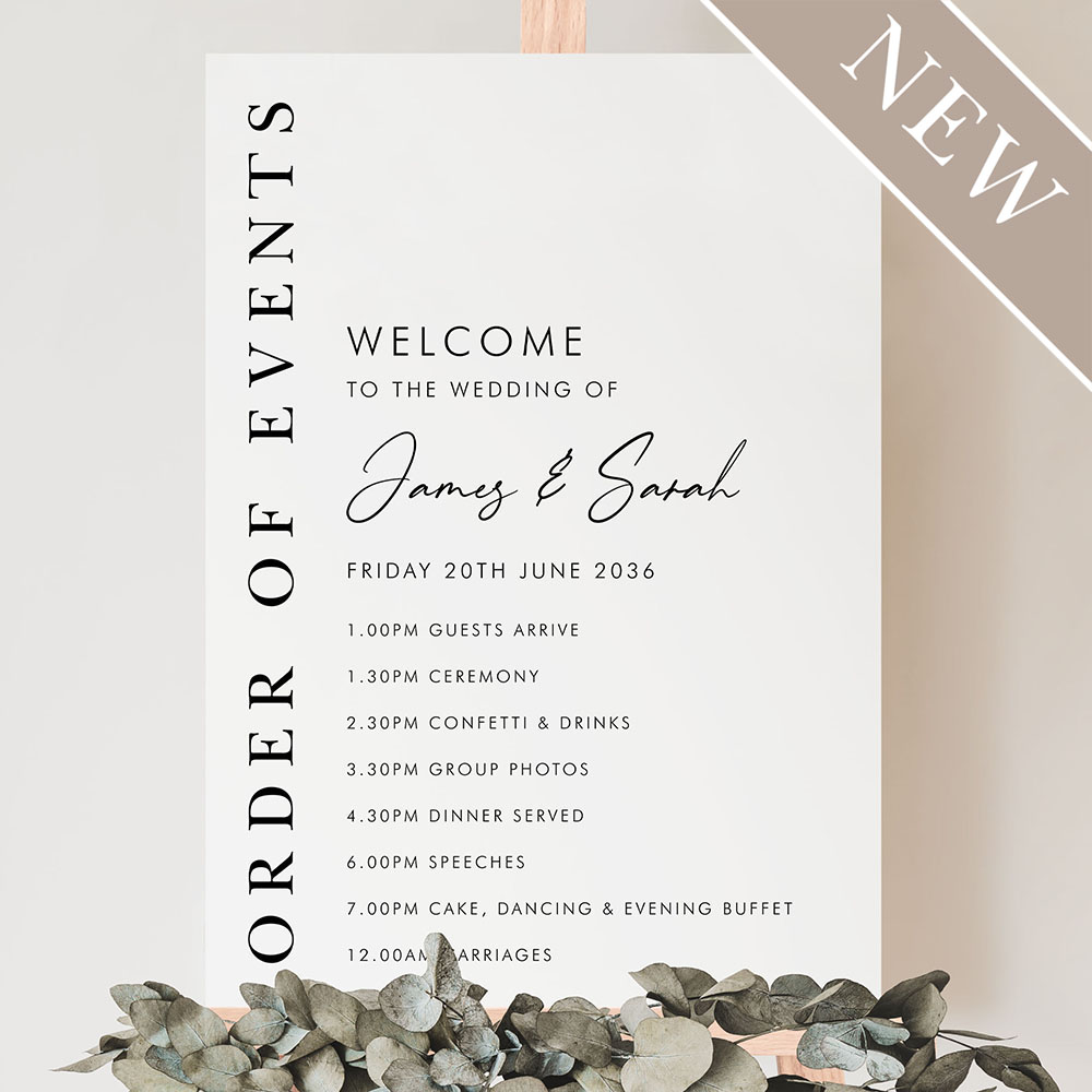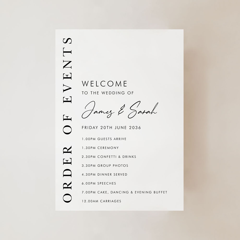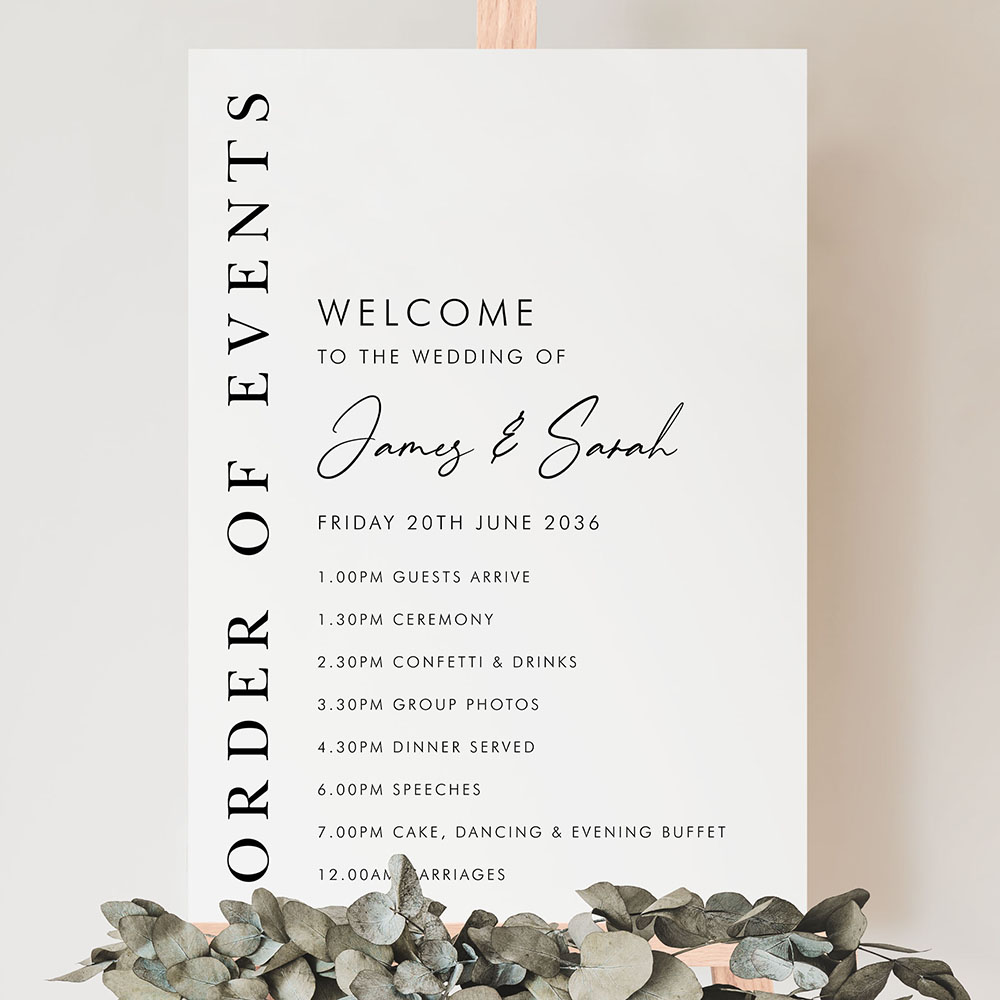 Our Matthew Portrait Order of Events Sign combines vertical serif lettering with a modern layout to create a clean, sophisticated welcome. Featuring your timeline details alongside a bold “Order of Events” column, this design is ideal for elegant and contemporary weddings. Printed onto your choice of durable Foamex board or card and available in A2, A1 or A0 sizes. Fonts and layout can be tailored to suit your day—just leave a note or get in touch with your custom request.