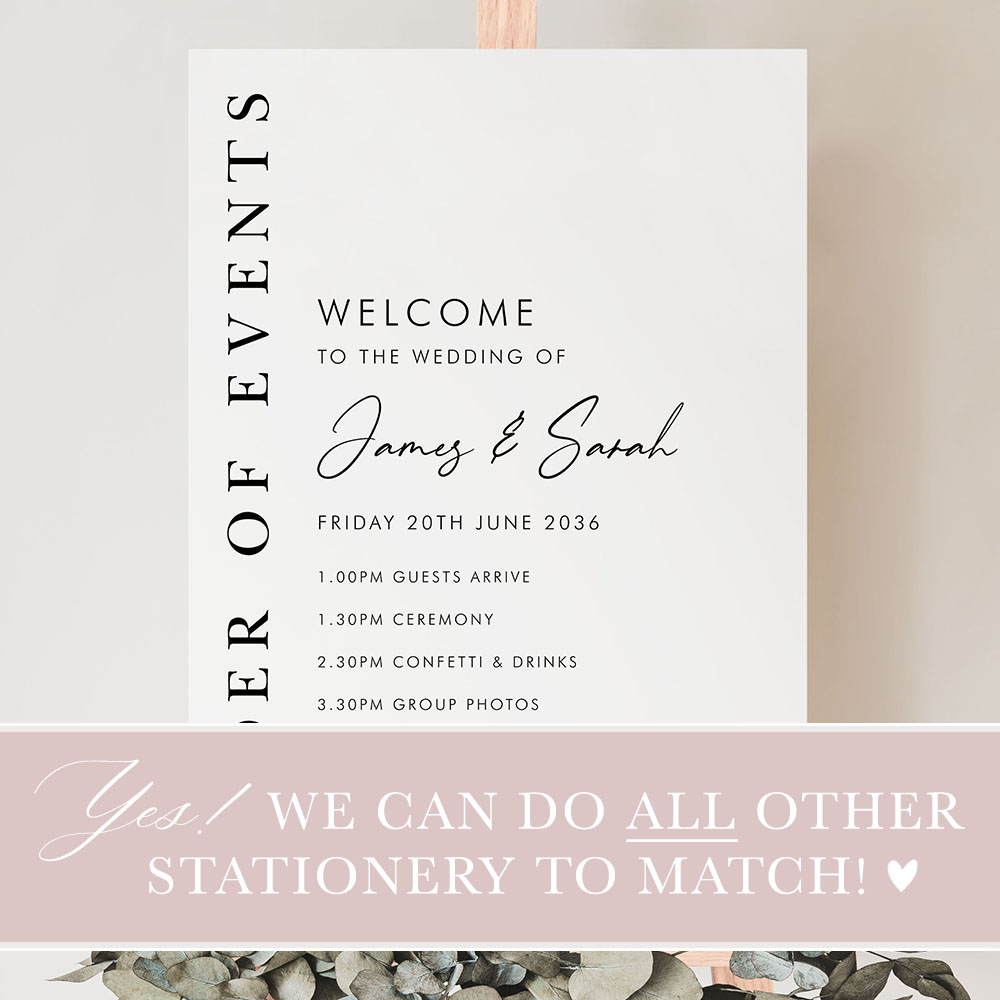 As with all our stationery, our signs and posters are fully customised for you and are easily adapted for any other occasion such as birthdays, balls, christenings, sporting events etc. Make the most of it and select double-sided printing to turn it into a dual-purpose display!