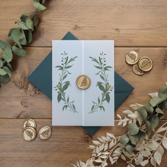 SLEEVE WITH MATCHING STICKER – Personalised sleeves with matching round personalised stickers. Let us know whether you’d like a matt, gloss, or transparent sticker. If not specified, they will come with matt stickers as standard. If you’ve opted to have your invitations on Premium card, let us know whether you’d prefer your sleeves to be on white or ivory paper.