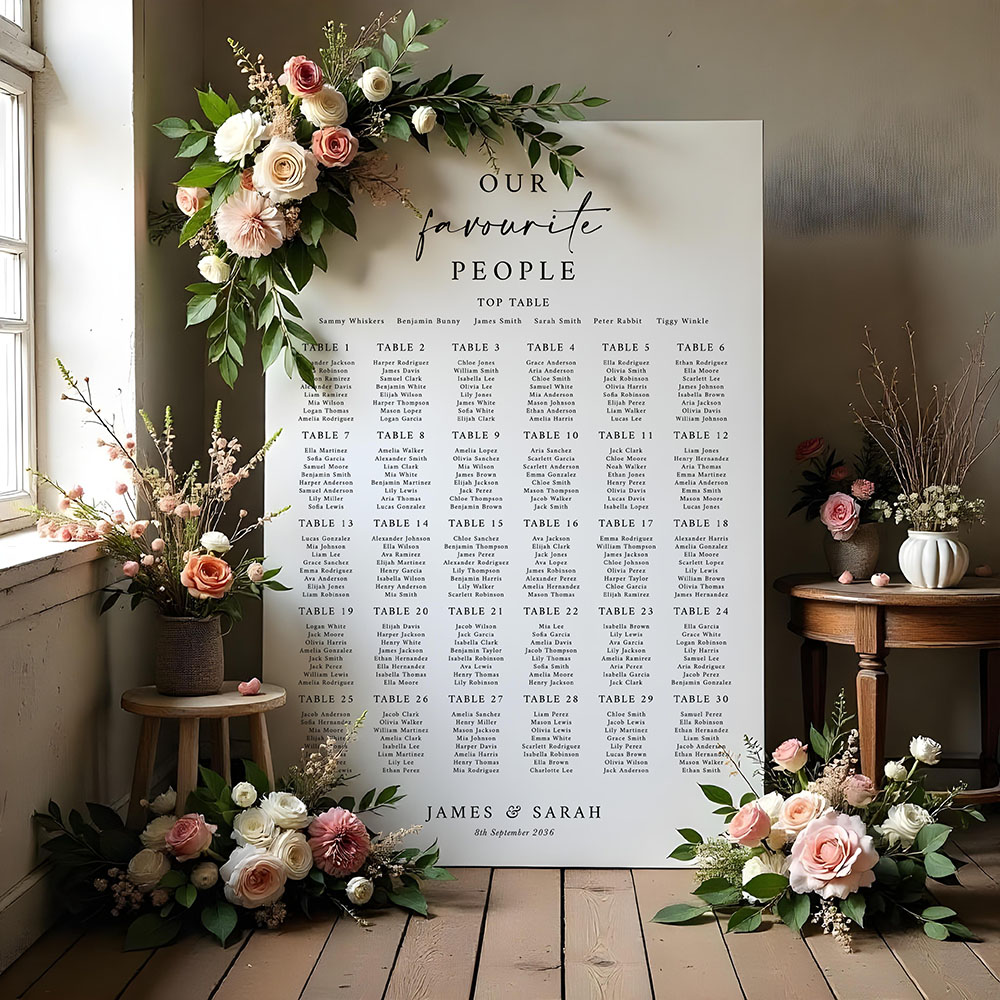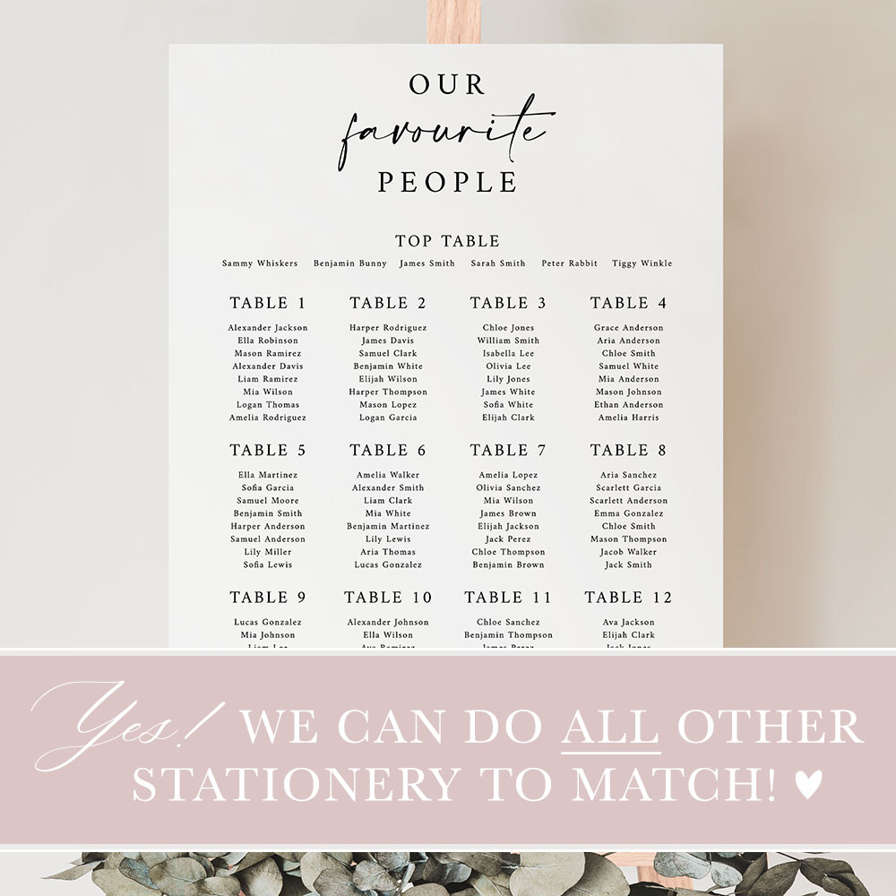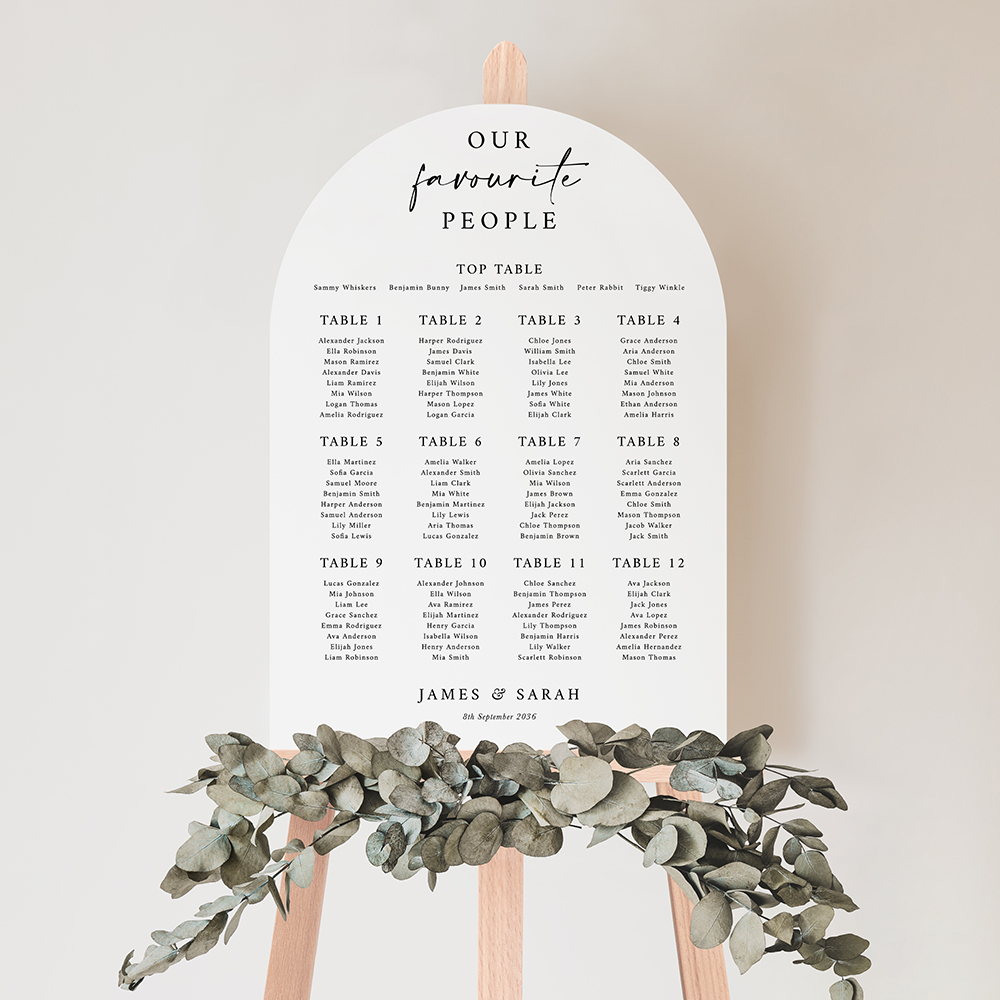 Our Modern 1 Table Plan features a clean, minimalist layout with crisp typography—perfect for modern weddings and events. All of our table plans can be adapted for large guest lists, including layouts with over 30 tables. Printed on your choice of 2mm card for framing or sturdy 5mm Foamex board (arch shape also available), each design is fully customisable. You’ll receive a digital proof before printing and we’re happy to tweak fonts, layouts or create something bespoke, just ask!