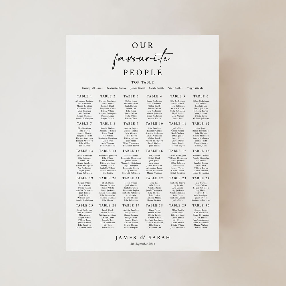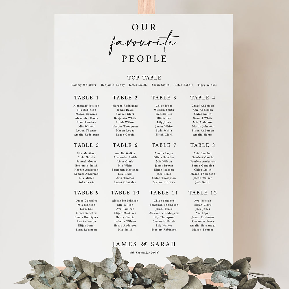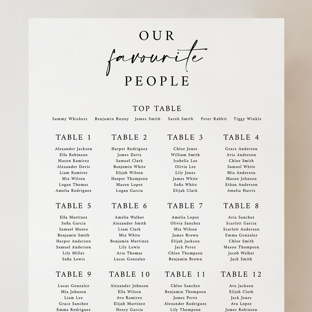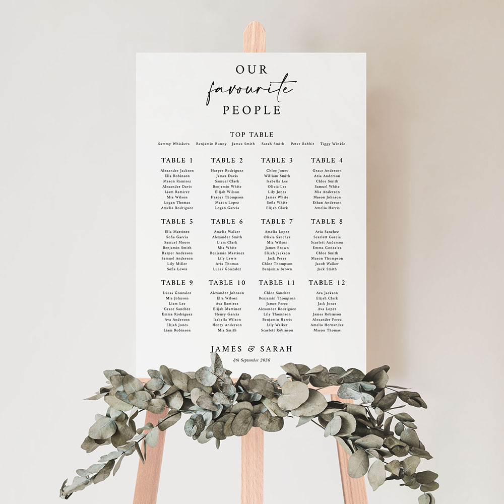 Our Modern 1 Table Plan features a clean, minimalist layout with crisp typography—perfect for modern weddings and events. All of our table plans can be adapted for large guest lists, including layouts with over 30 tables. Printed on your choice of 2mm card for framing or sturdy 5mm Foamex board (arch shape also available), each design is fully customisable. You’ll receive a digital proof before printing and we’re happy to tweak fonts, layouts or create something bespoke, just ask!