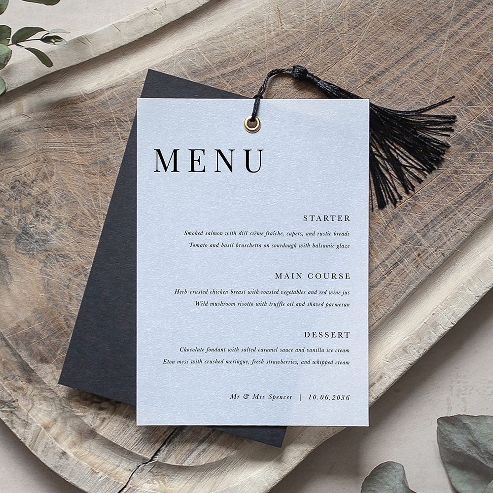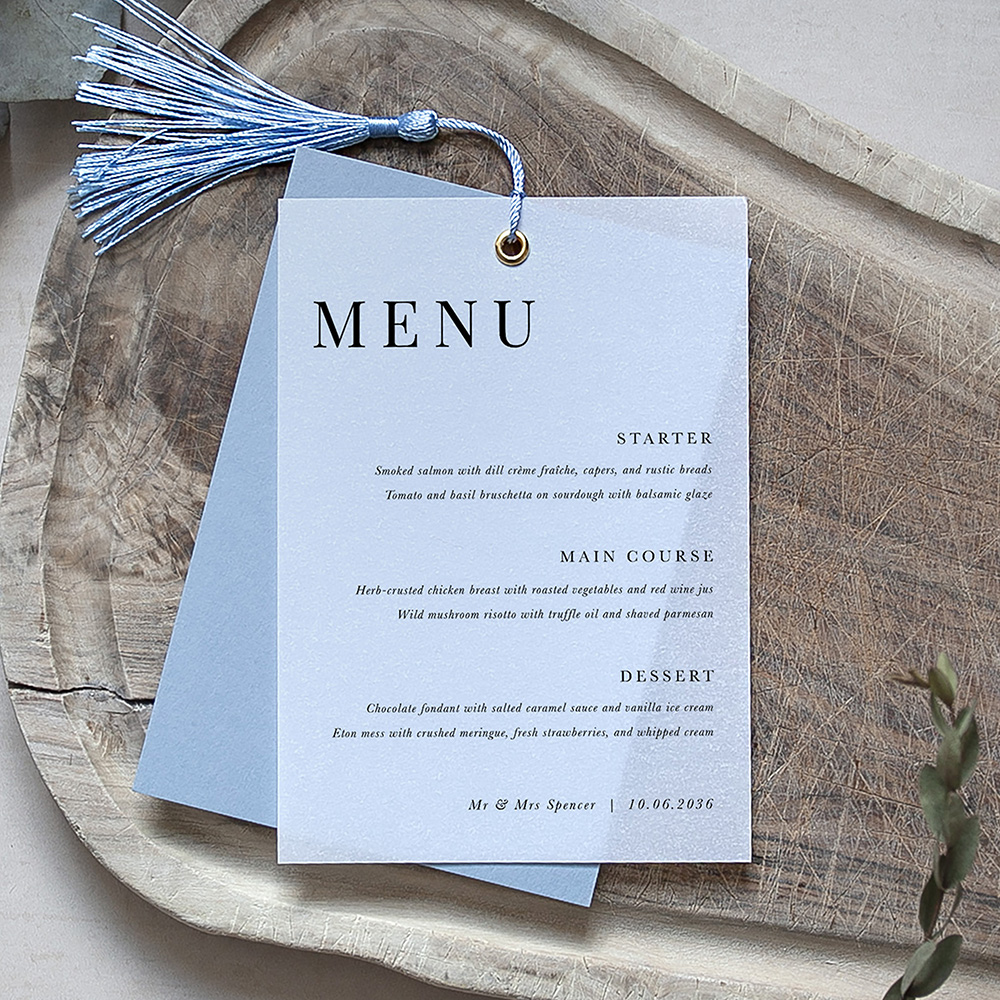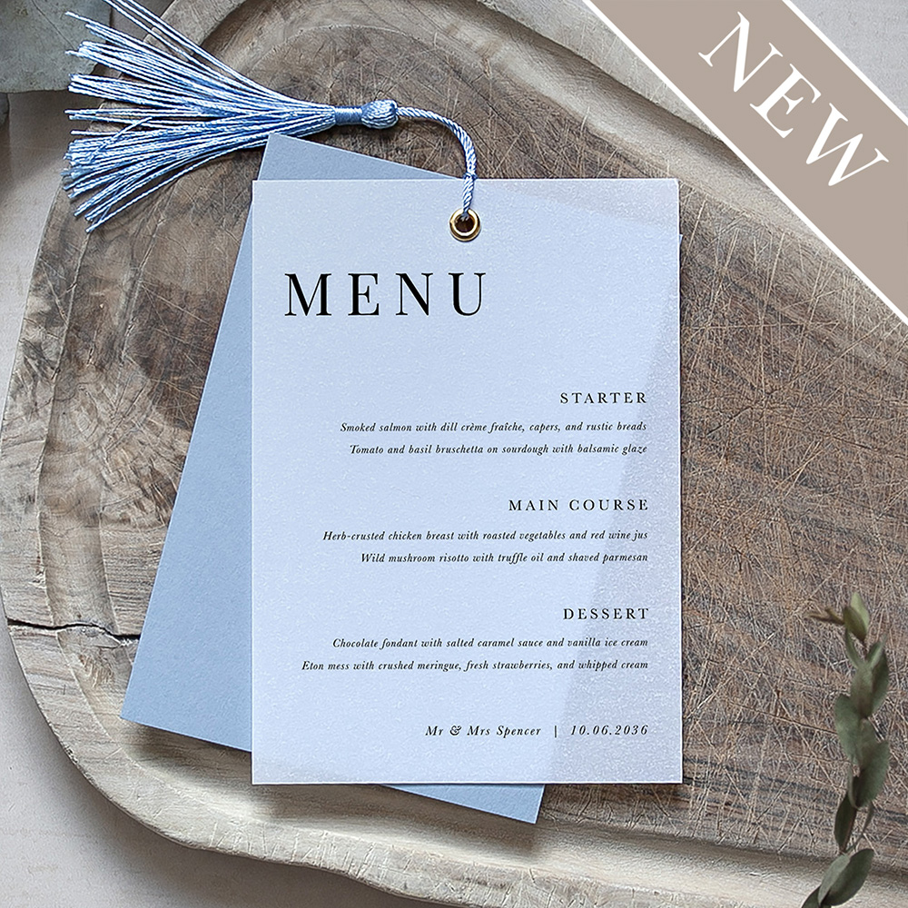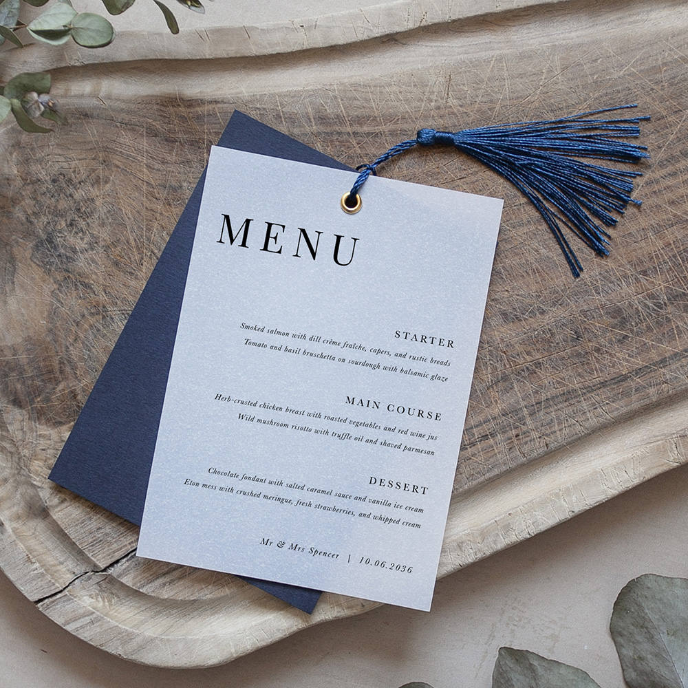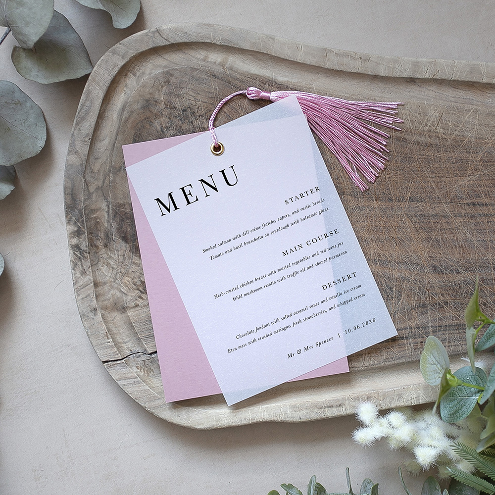 The finishing touch is a practical grommet that neatly attaches the vellum to the backing card. A matching tassel accompanies it, adding a bit of flair. This vellum menu, with its balanced blend of simplicity and sophistication, is sure to enhance any dining experience. With lots of card and tassel colours to choose from, you’re sure to find something to fit your theme. Available in 2 sizes with optional guest names and personalised guest menu choices. It's more than just a menu - it's a conversation starter, a detail that won't go unnoticed by your guests.