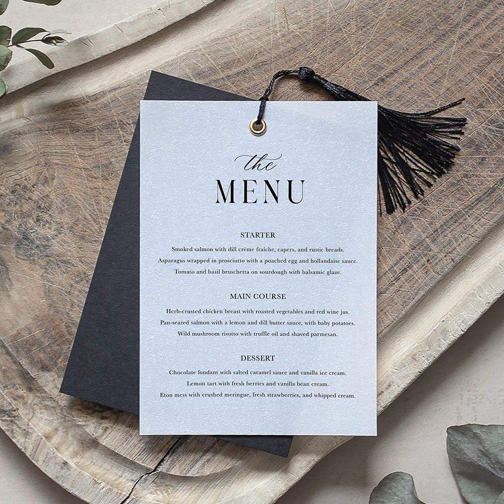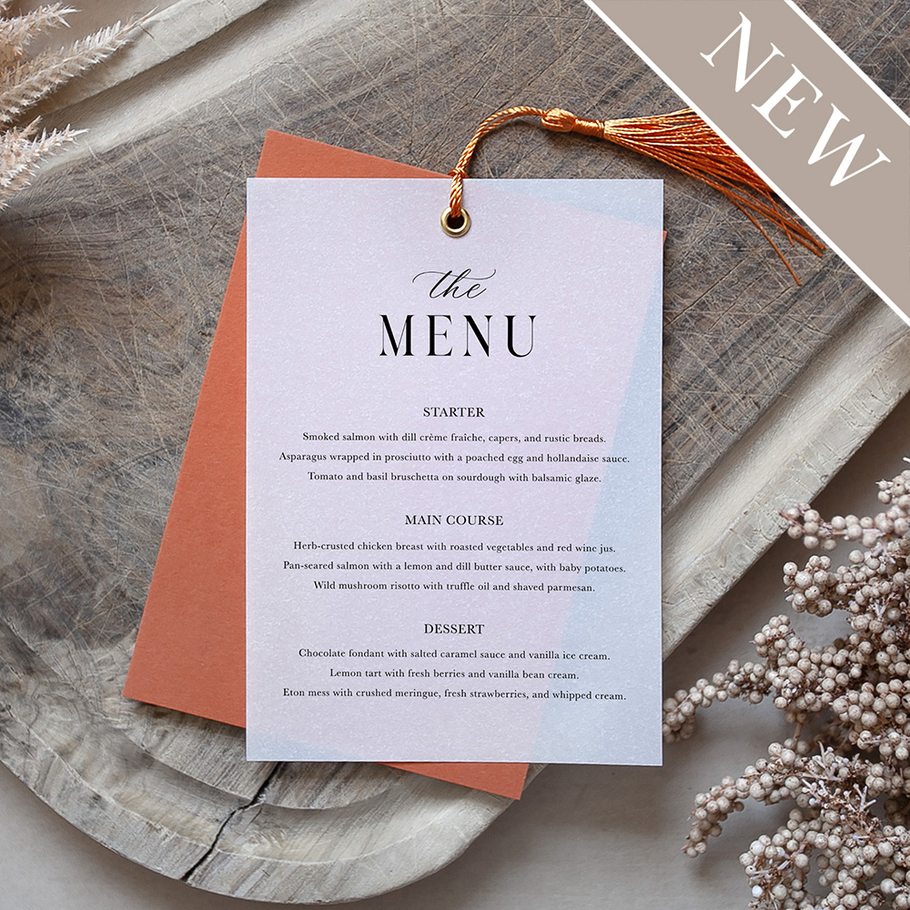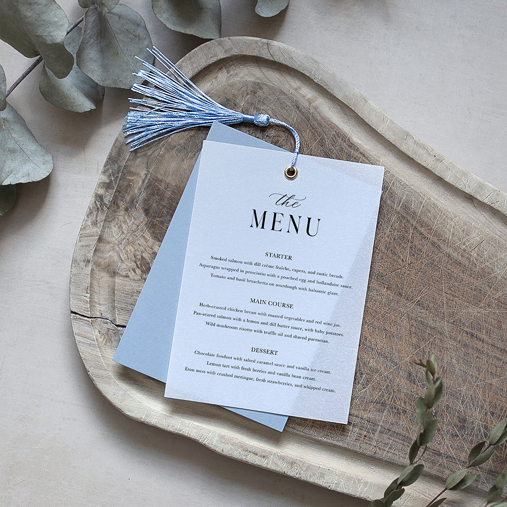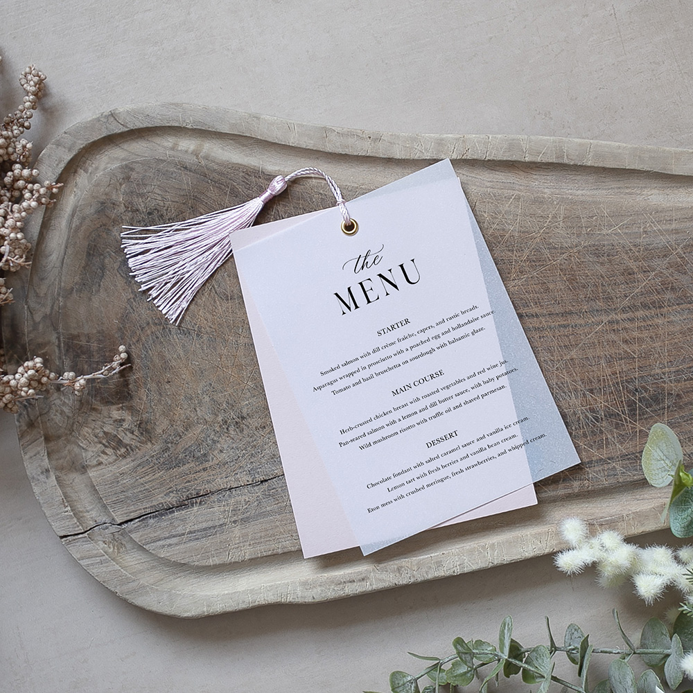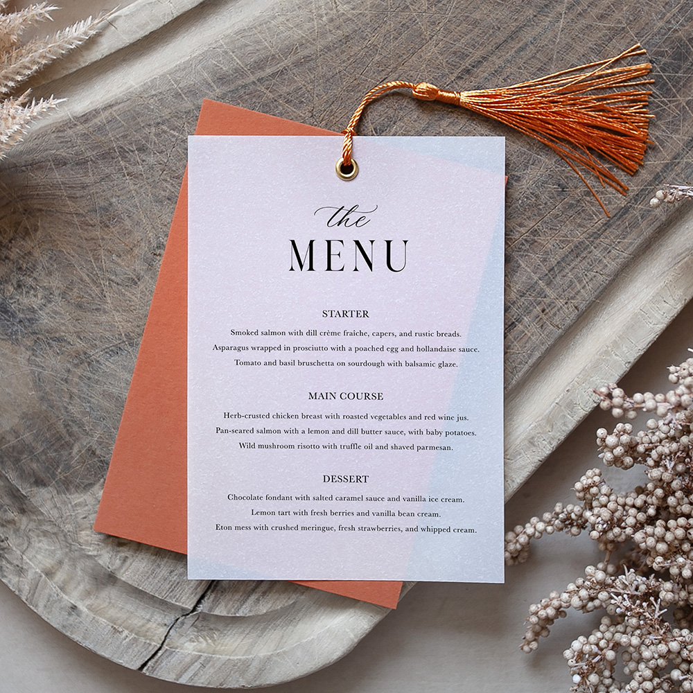 The finishing touch is a practical grommet that neatly attaches the vellum to the backing card. A matching tassel accompanies it, adding a bit of flair. This vellum menu, with its balanced blend of simplicity and sophistication, is sure to enhance any dining experience. With lots of card and tassel colours to choose from, you’re sure to find something to fit your theme. Available in 2 sizes with optional guest names and personalised guest menu choices. It's more than just a menu - it's a conversation starter, a detail that won't go unnoticed by your guests.