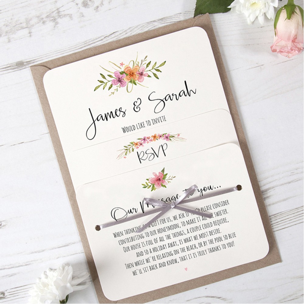 The Multi Floral Watercolour hole punched wedding invitation features a mix of soft floral illustrations painted in gentle watercolour style. Delicate blooms and botanical accents frame the wording, creating a romantic and artistic design suited to spring and summer weddings. The staggered card layout keeps all elements hole punched and tied together with ribbon or twine.