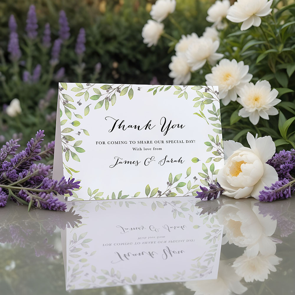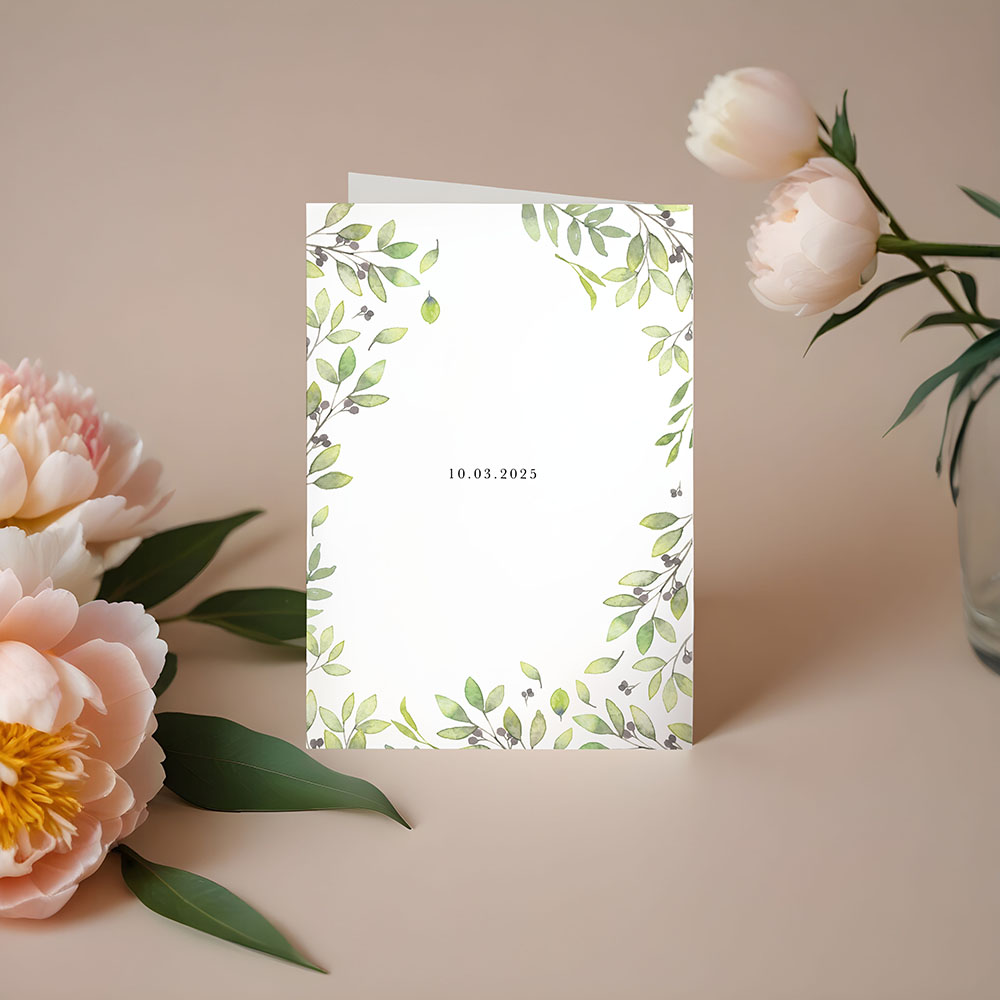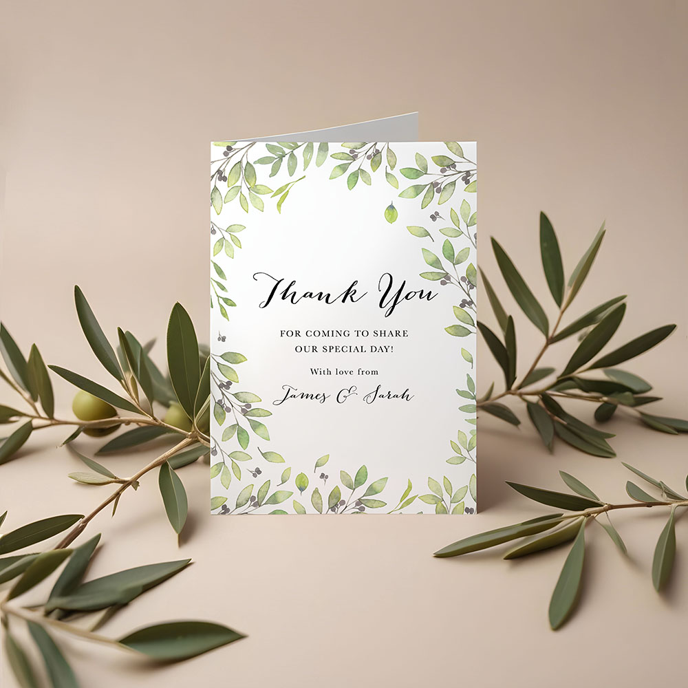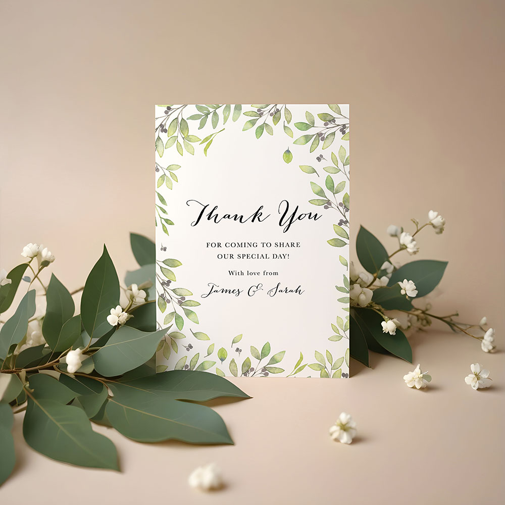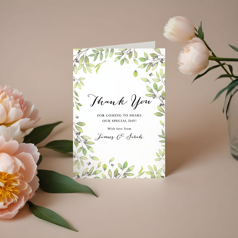 Our Arabella folded thank you card features a delicate border of hand-painted green leaves, bringing a fresh and natural feel to your heartfelt message. It’s designed to beautifully showcase your wedding photo and create a lasting memento for your guests.
