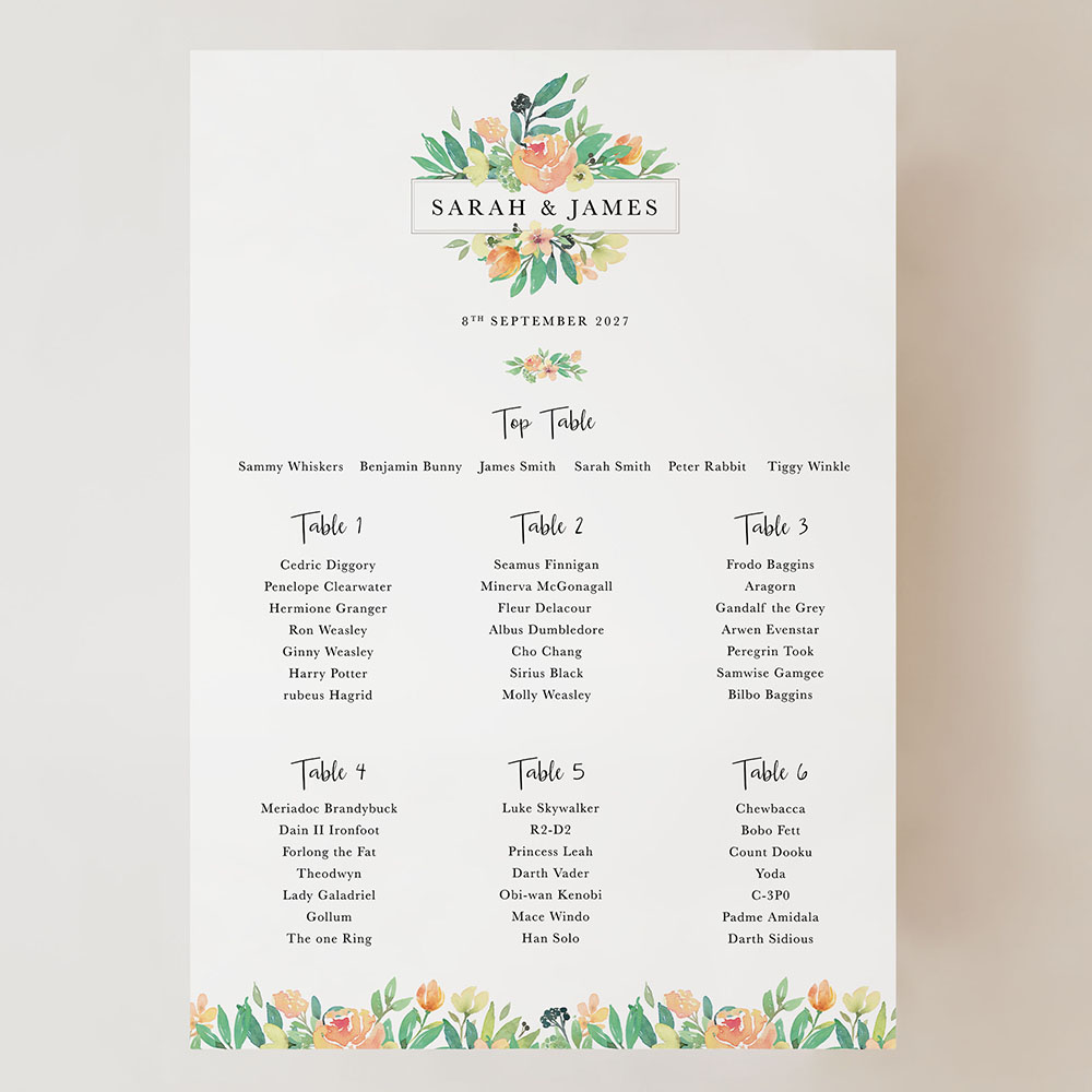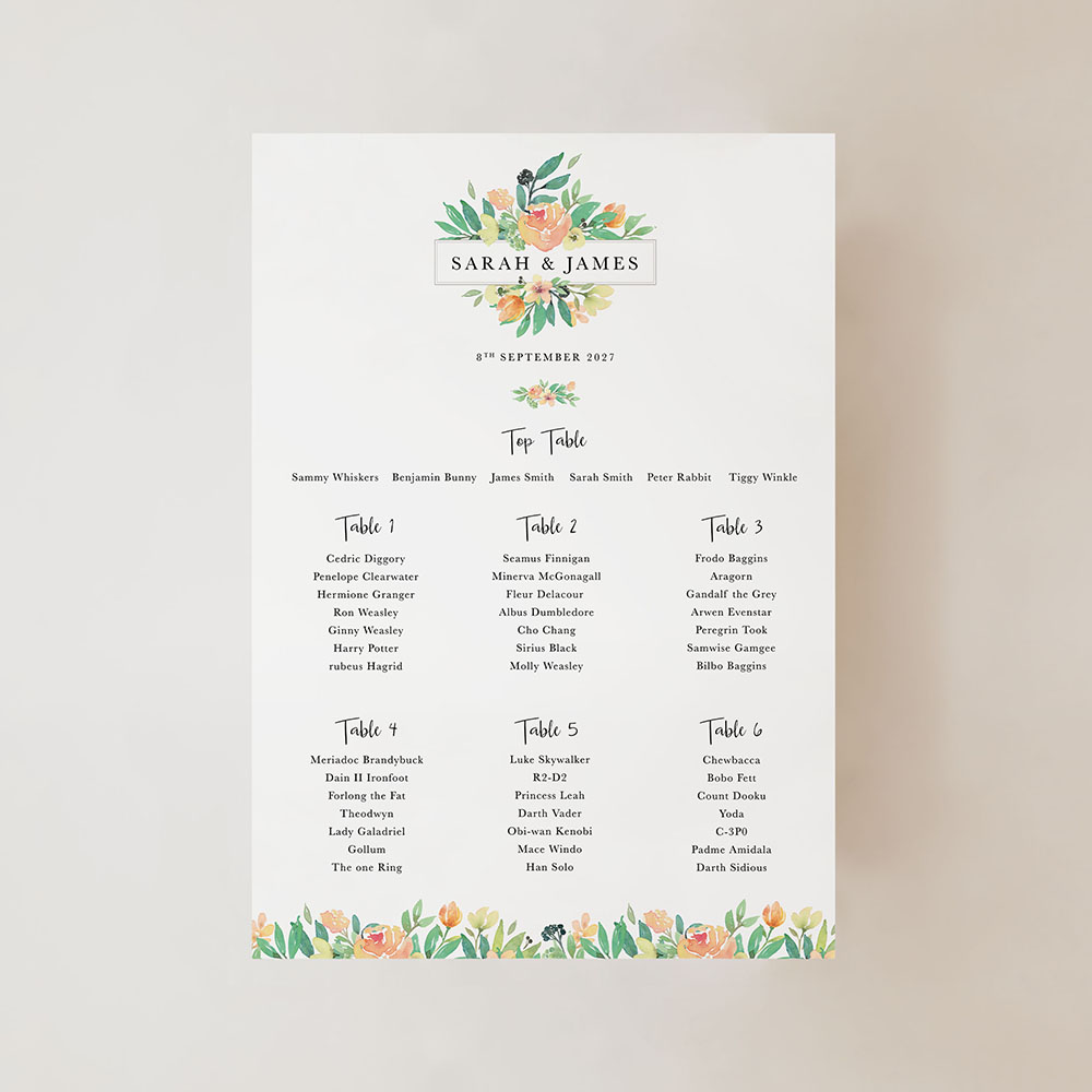 We recommend the A3 design for up to a maximum of 7 tables (top table + 6 others + a title section). If you would like to add more tables or if your tables are large, please consider the larger A2 and A1 options available.