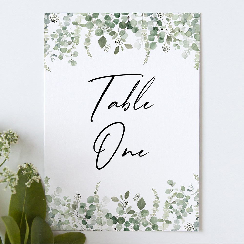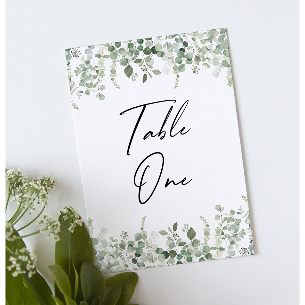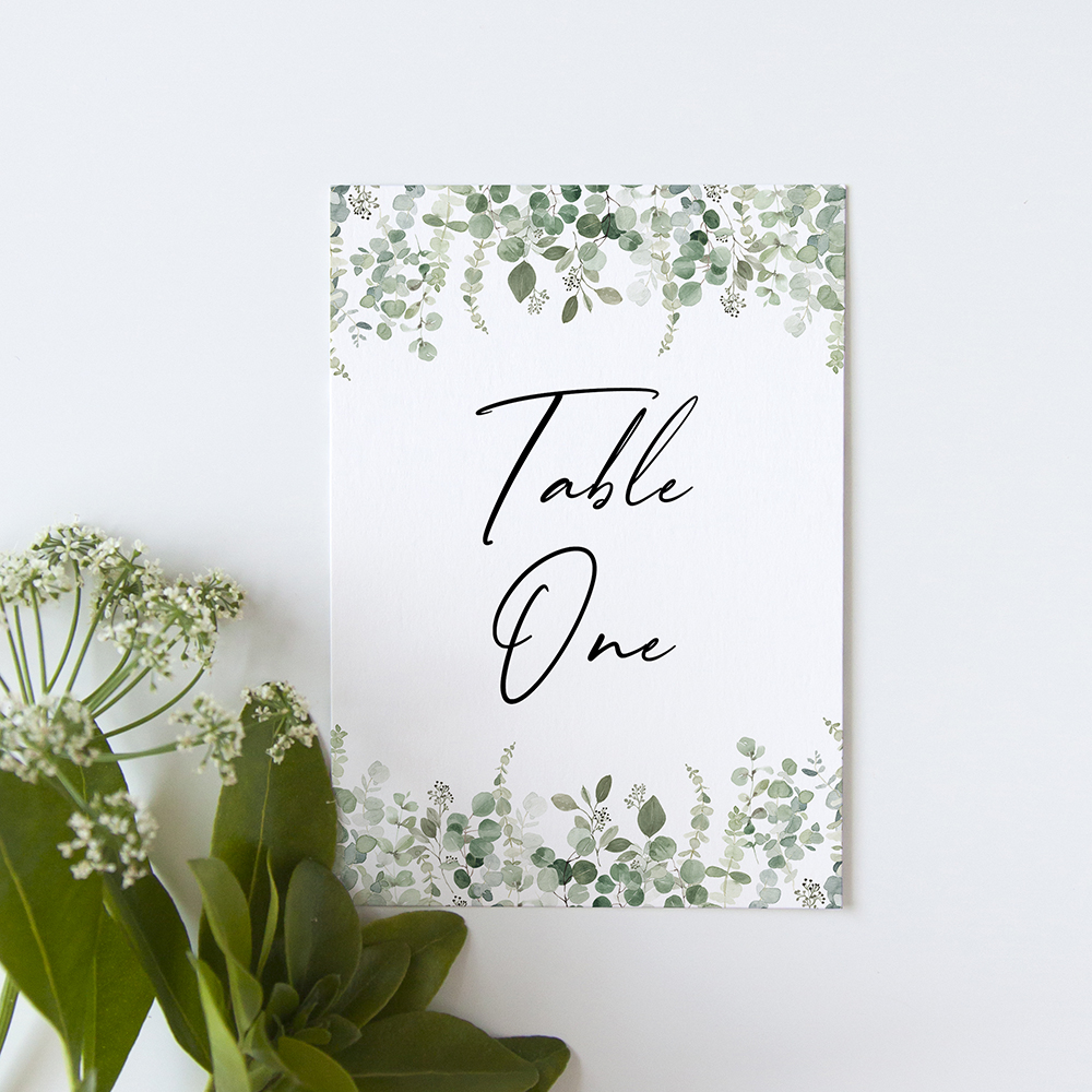 Our Classic Eucalyptus CE14 table numbers are adorned with lush cascading leaves in rich green tones. Each personalised card adds freshness and depth to your table décor. Ideal for botanical, modern, or destination weddings with natural style.