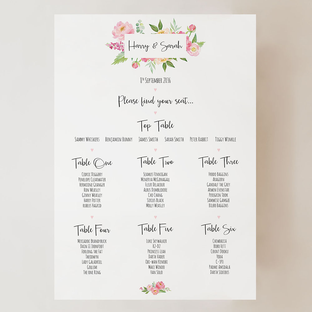 These table plans are easily adapted for any other occasion such as birthdays, balls, christenings, sporting events etc. Make the most of it and select double-sided printing to turn it into a dual-purpose display!