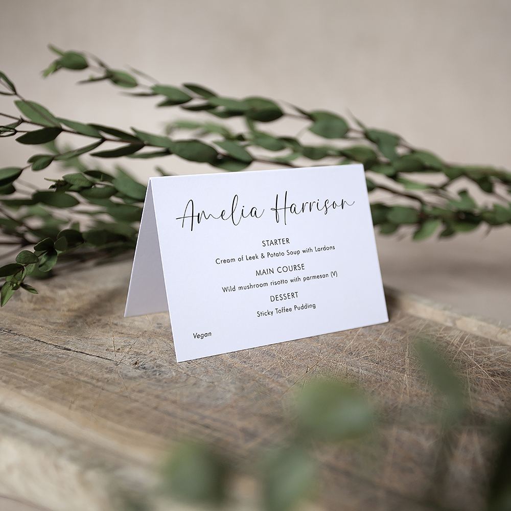 Make your guests feel extra special with our personalised place cards, featuring their names and menu choices. These cards serve as a practical reminder of their order and help waiting staff when serving. Our carefully crafted cards are creased to ensure easy folding without any damage or unsightly dents. They add an elegant touch to your wedding stationery and are a thoughtful way to show your appreciation for your guests' presence on your special day.