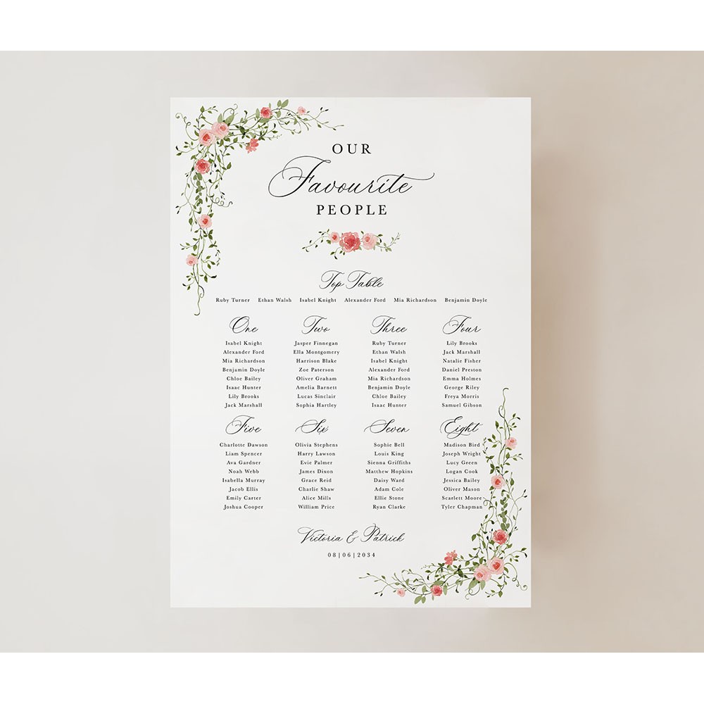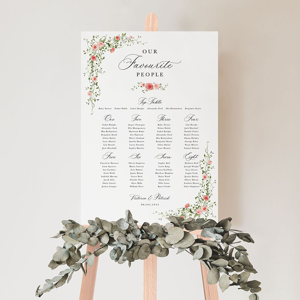 Our large, printed table plans are an elegant way to help your guests find their seat. Each one is printed onto your choice of a quality 2mm thick card for framing or onto a rigid, sturdy, water-resistant 5mm Foamex board.  Arch shaped boards also available. All printing is done onto a white background.