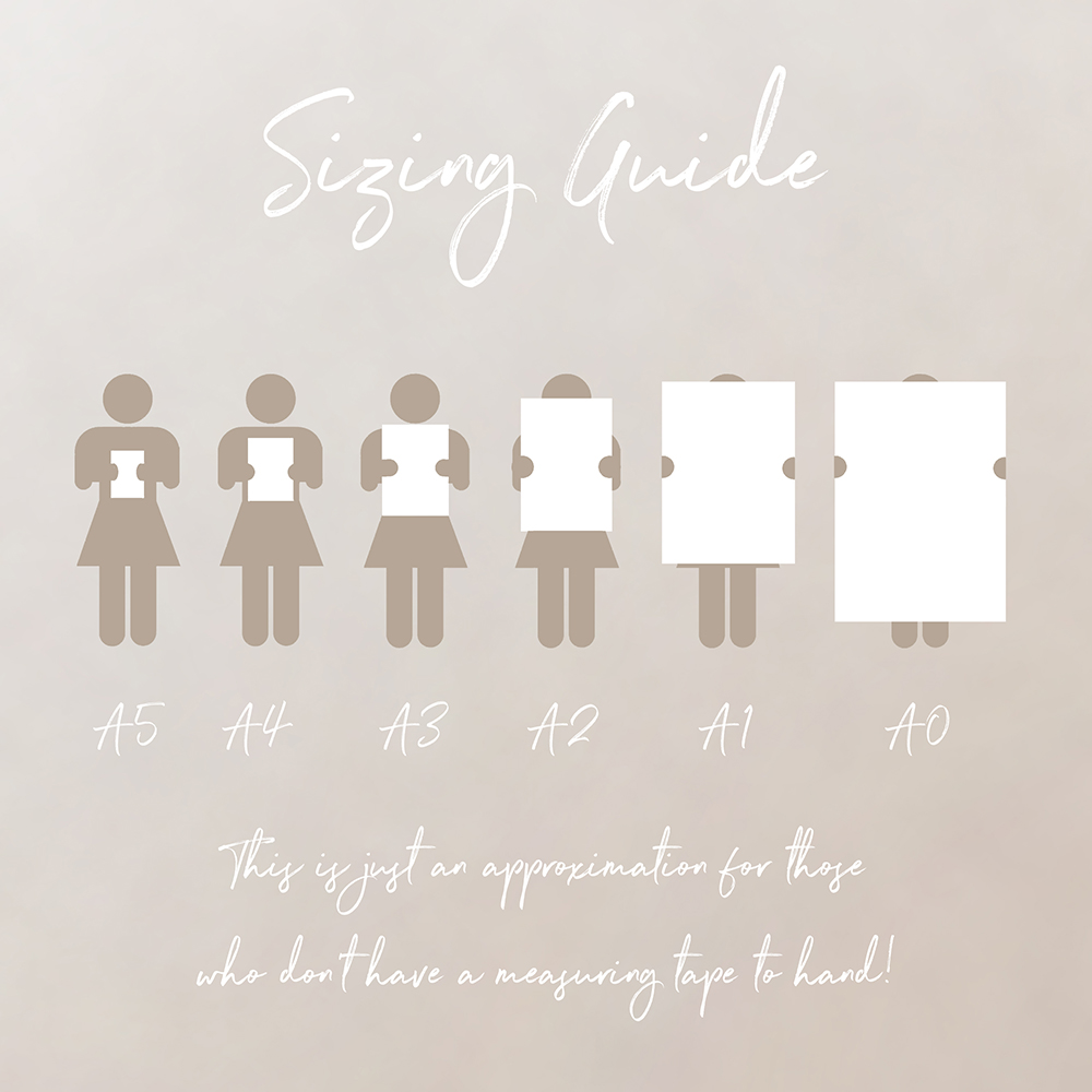 We offer three sizes: A2, A1, and A0. Select your preferred size from the options available. For more details, see the Sizing tab.