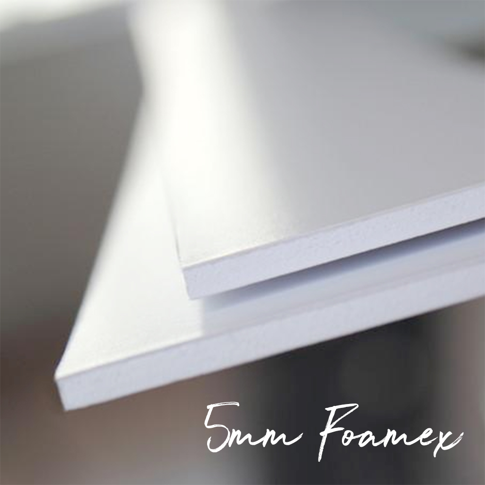 Foamex is a PVC foam board which is lightweight yet durable due to its fine cell structure and smooth, non-crumbling surface. It's water-resistant and ideal for display on easels or leaning against props. The boards are white, so any background colour will be printed.