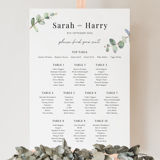 Welcome to our Table Plan collection - Discover flawless seating arrangement designs that perfectly complement your wedding theme. Say goodbye to seating stress and hello to a breeze! With stylish and customisable designs, create a seating plan that reflects your style and ensures a seamless experience for your guests. Get ready to make seating your guests a piece of cake!