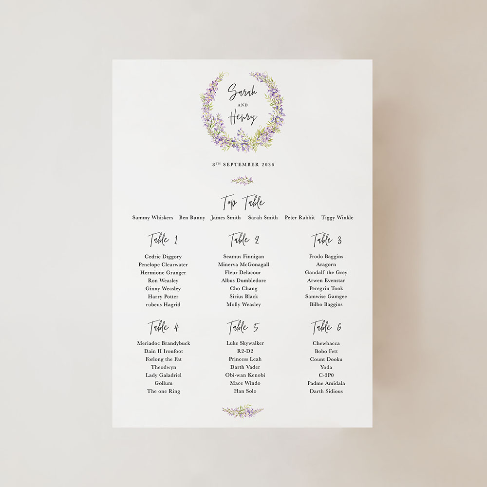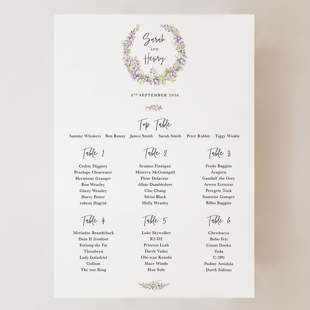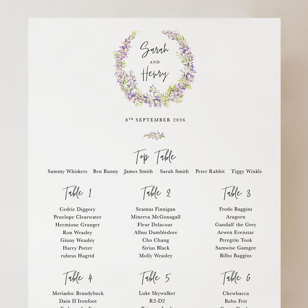 Email us at contact@vintageprints.co.uk with all the details you would like on your table plan. Please send all text typed with spelling and punctuation exactly as you would like it to appear as we copy and paste. Please do not use tabbing or spacing to space tables out. List each table separately, one below the other, as we need to be able to copy and paste each individual table.  We will create electronic proofs for you so that you have plenty of opportunity to make changes. Nothing goes to print until you are happy with it. Approved proofs are final, and we do not therefore limit the number of changes you can make to your electronic proofs within reason.