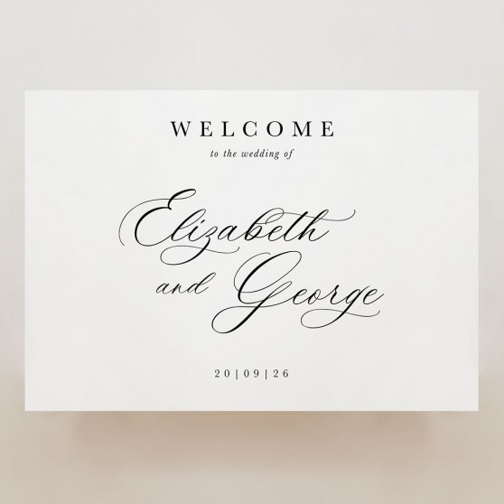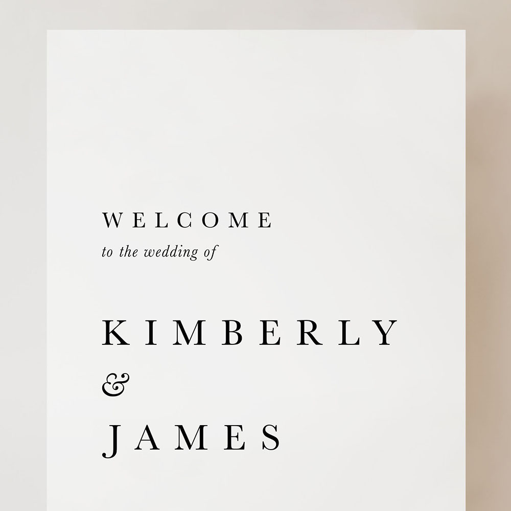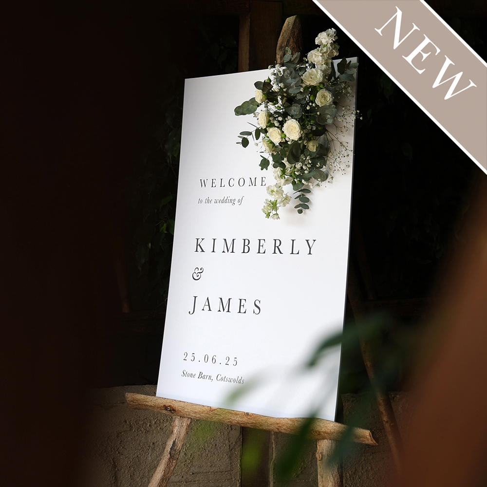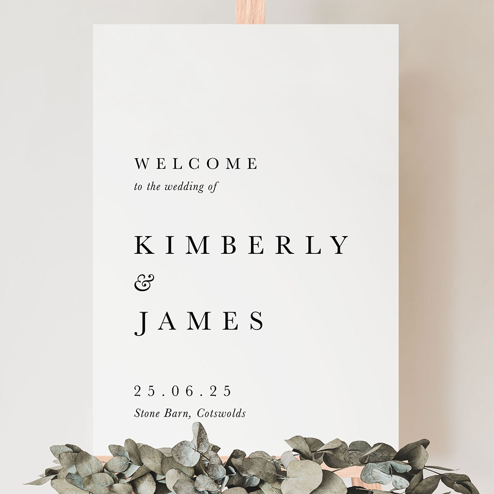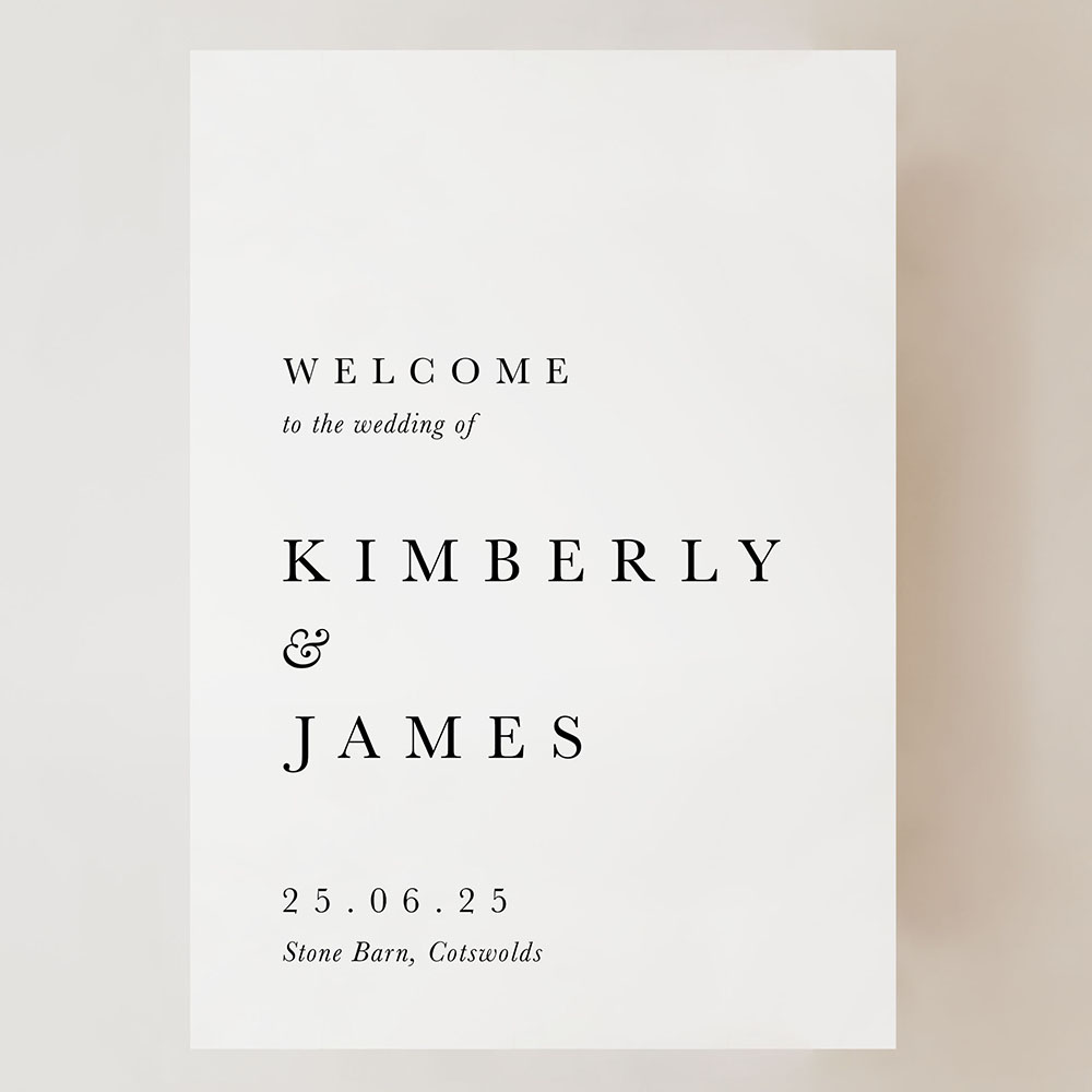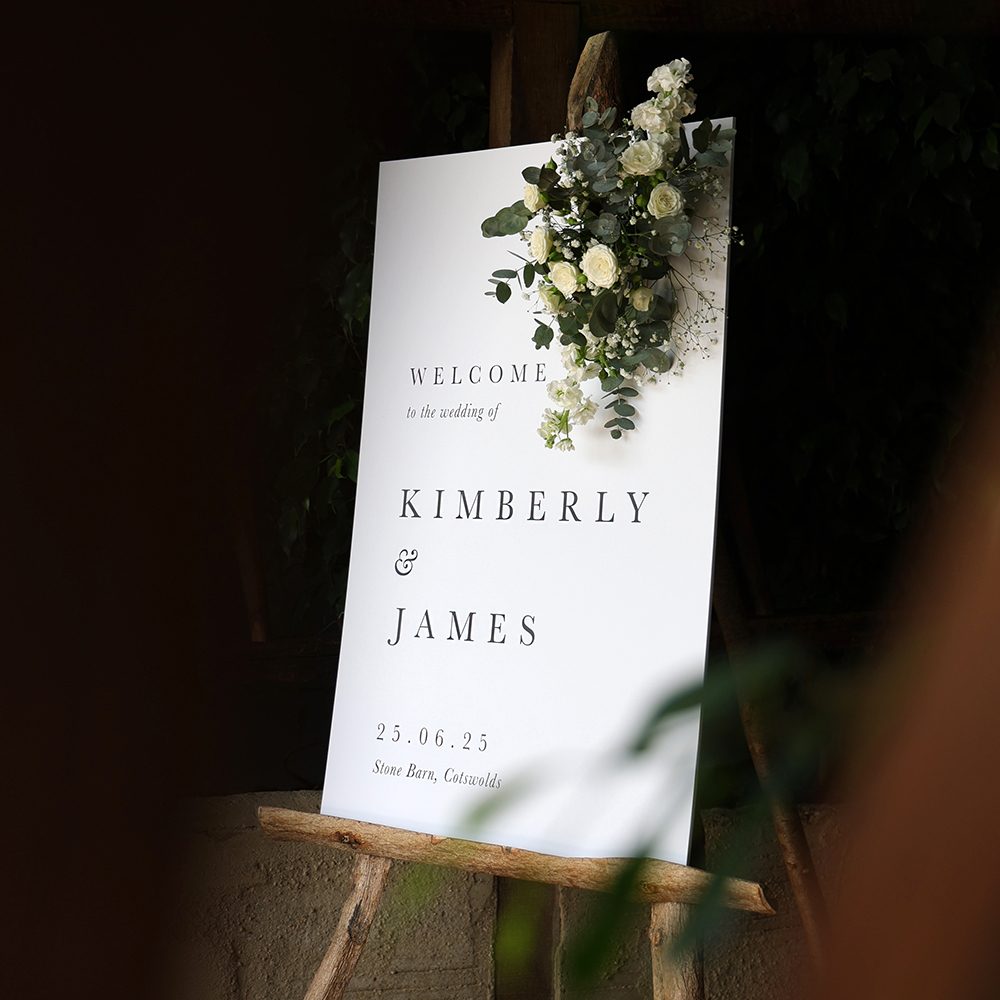 Named in honour of a very special day – the wedding of my brother James and his wife Kimberly (née Podmore) – this timeless welcome sign design is simple, elegant, and beautifully understated. The crisp black text is laid out with refined spacing for a modern yet classic feel, making it perfect for a stylish country or city wedding alike.