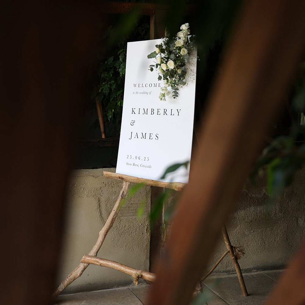 Originally displayed at Stone Barn in the Cotswolds, this design works well with or without floral arrangements and suits a range of styling options. Printed on your choice of sturdy Foamex board, thick card, or lightweight poster paper, each sign is fully customisable to suit your names, venue, and date.