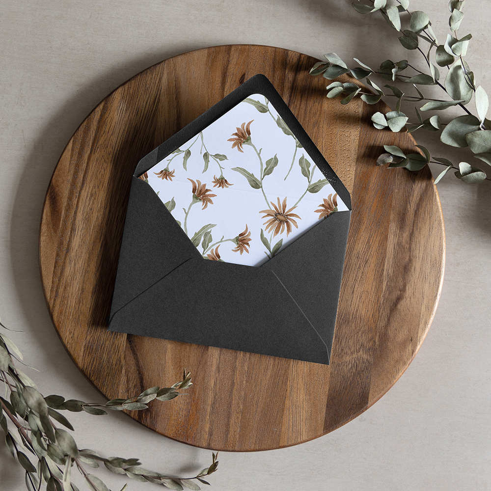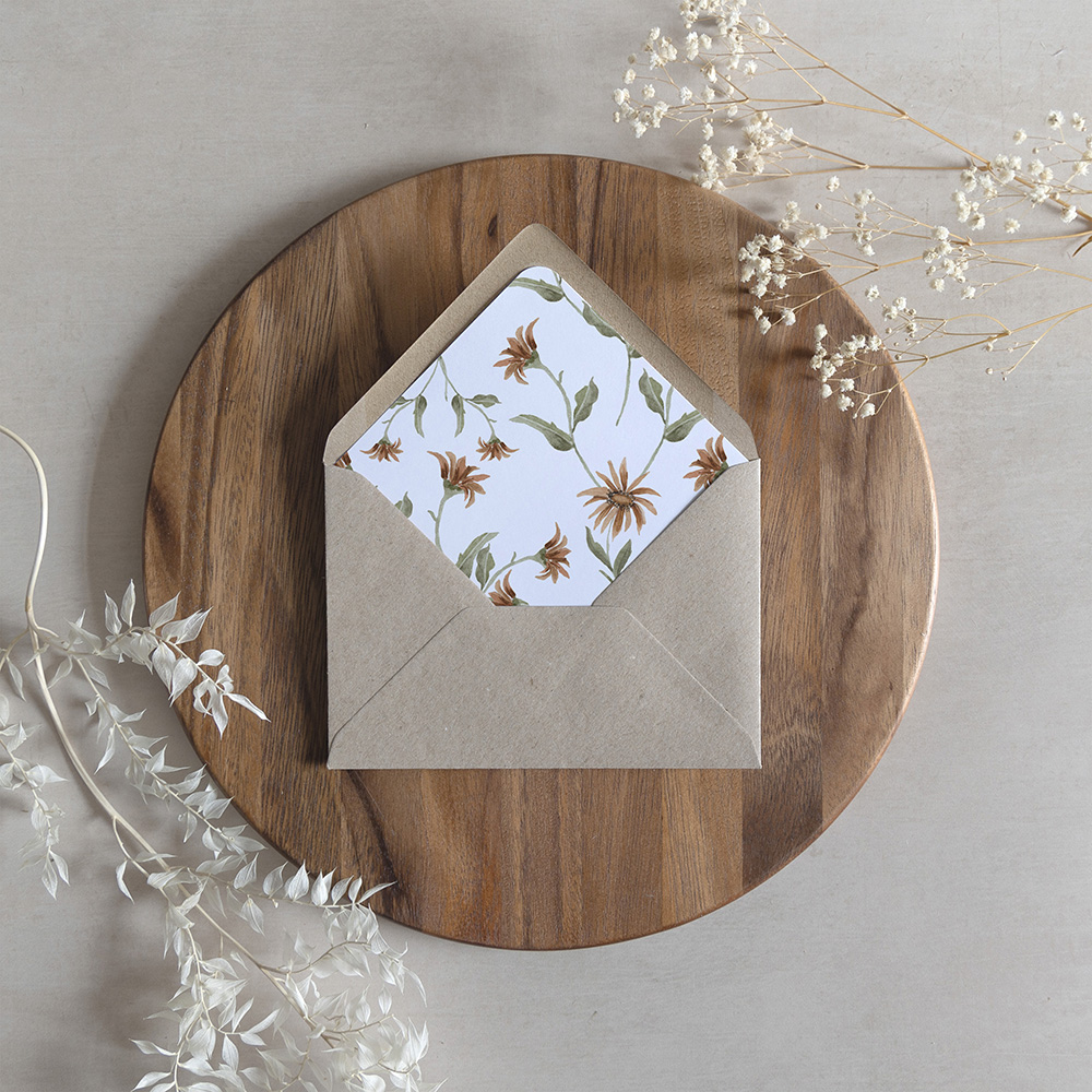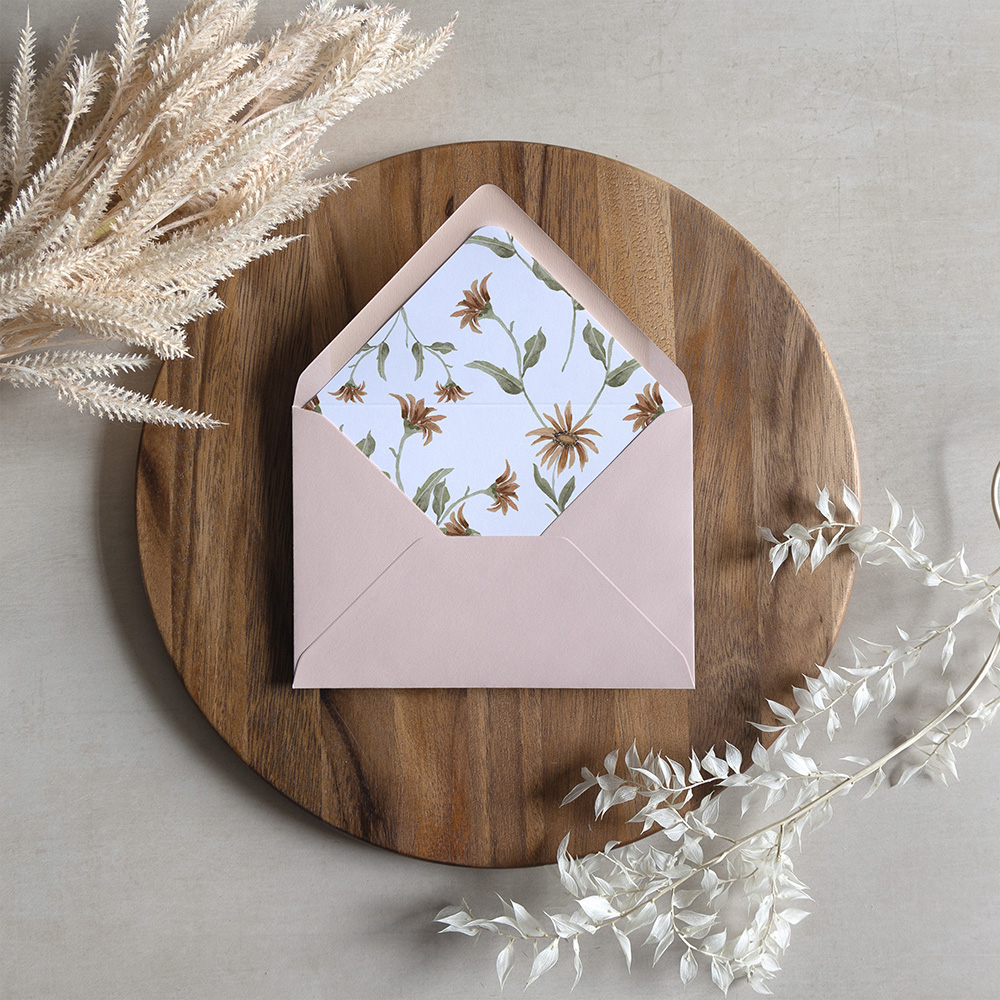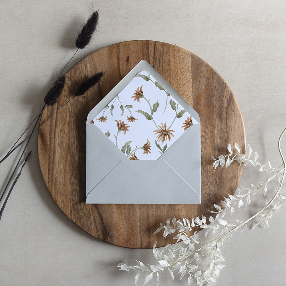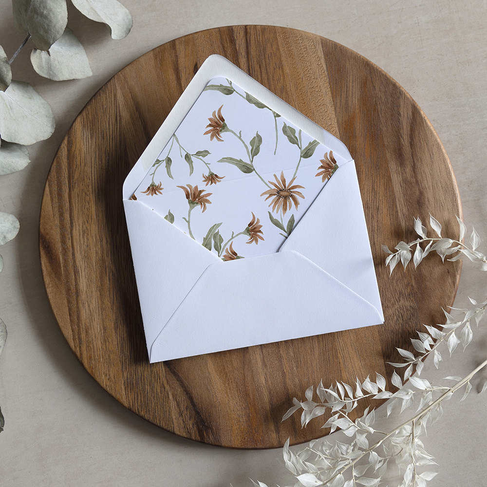 The Secret Garden Orange liner scatters golden and cream flowers with leafy sprigs for a warm, rustic floral look. Ideal for autumn or nature-inspired weddings.