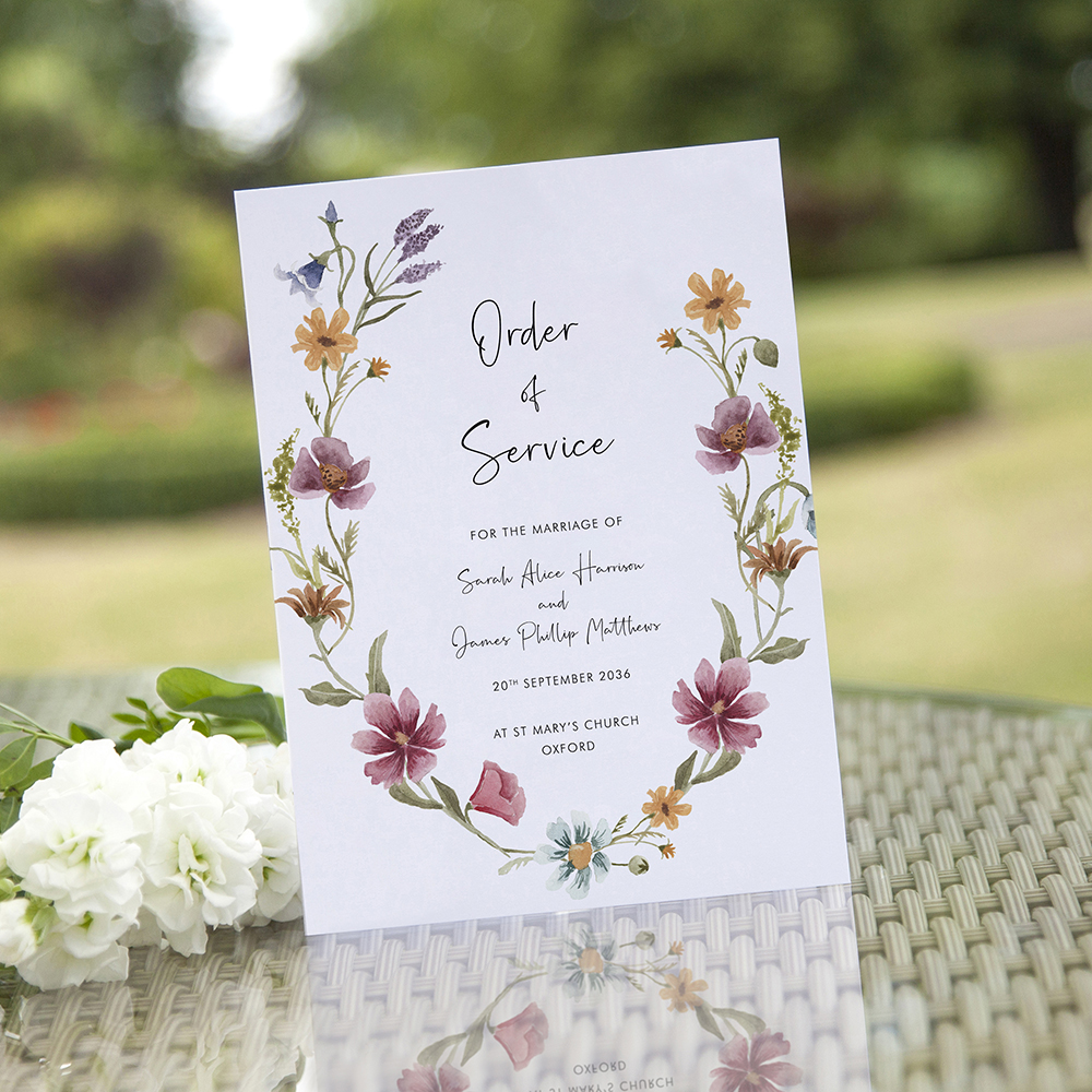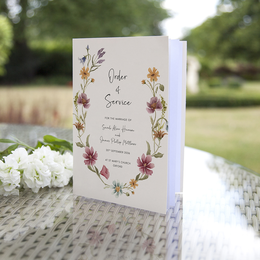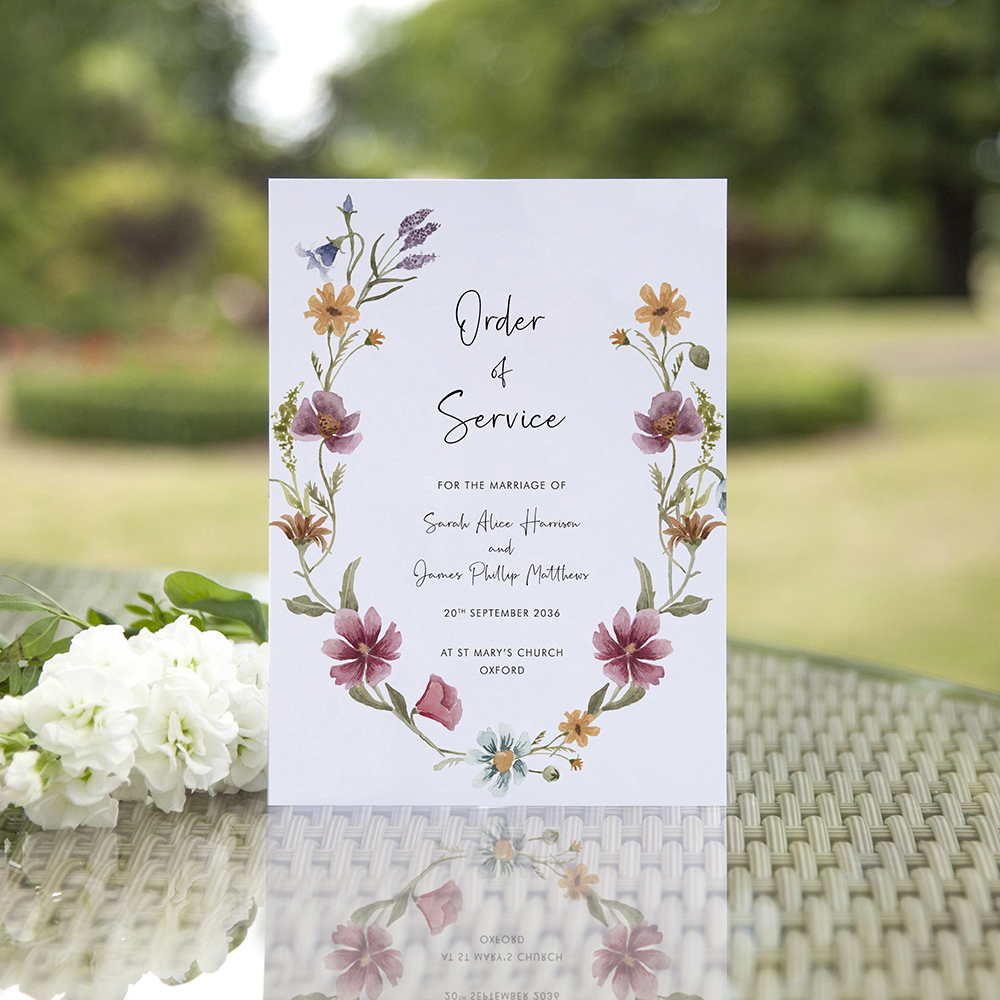 Our Orders of Service are fully customised for the perfect finish. You choose the design, text, and layout. You can have printing on every side of the cover and inserts. We want you to be excited to hand them out to your guests. We are careful to select only the best quality card so that we can create something worth hanging onto as a keepsake from the big day. If you’ve bought stationery from us in the past, then we can edit these to match.