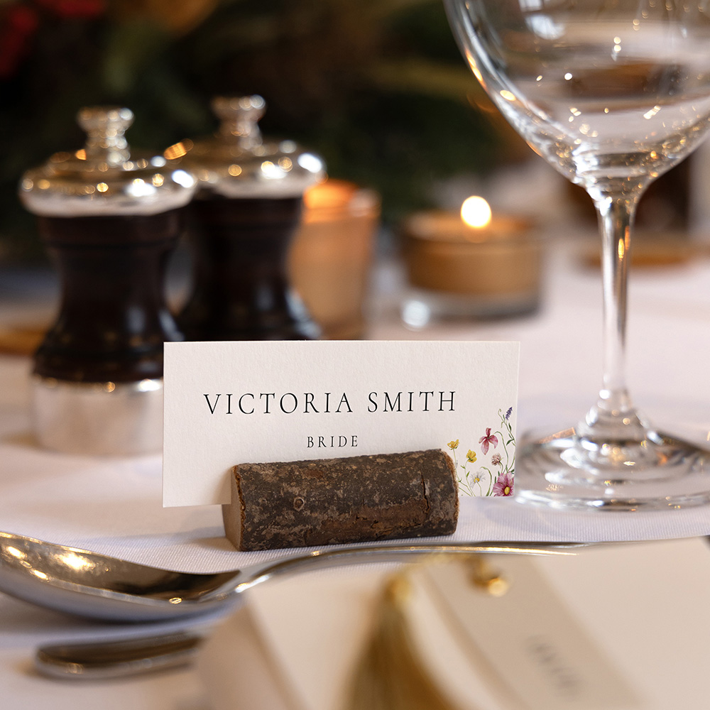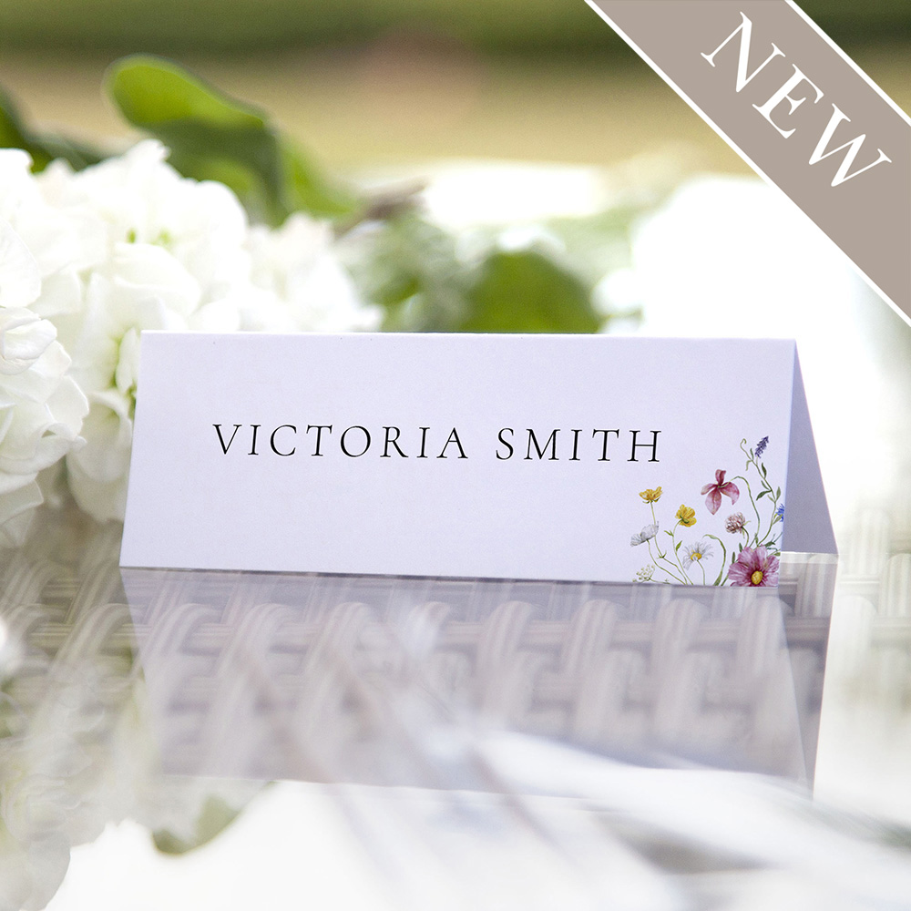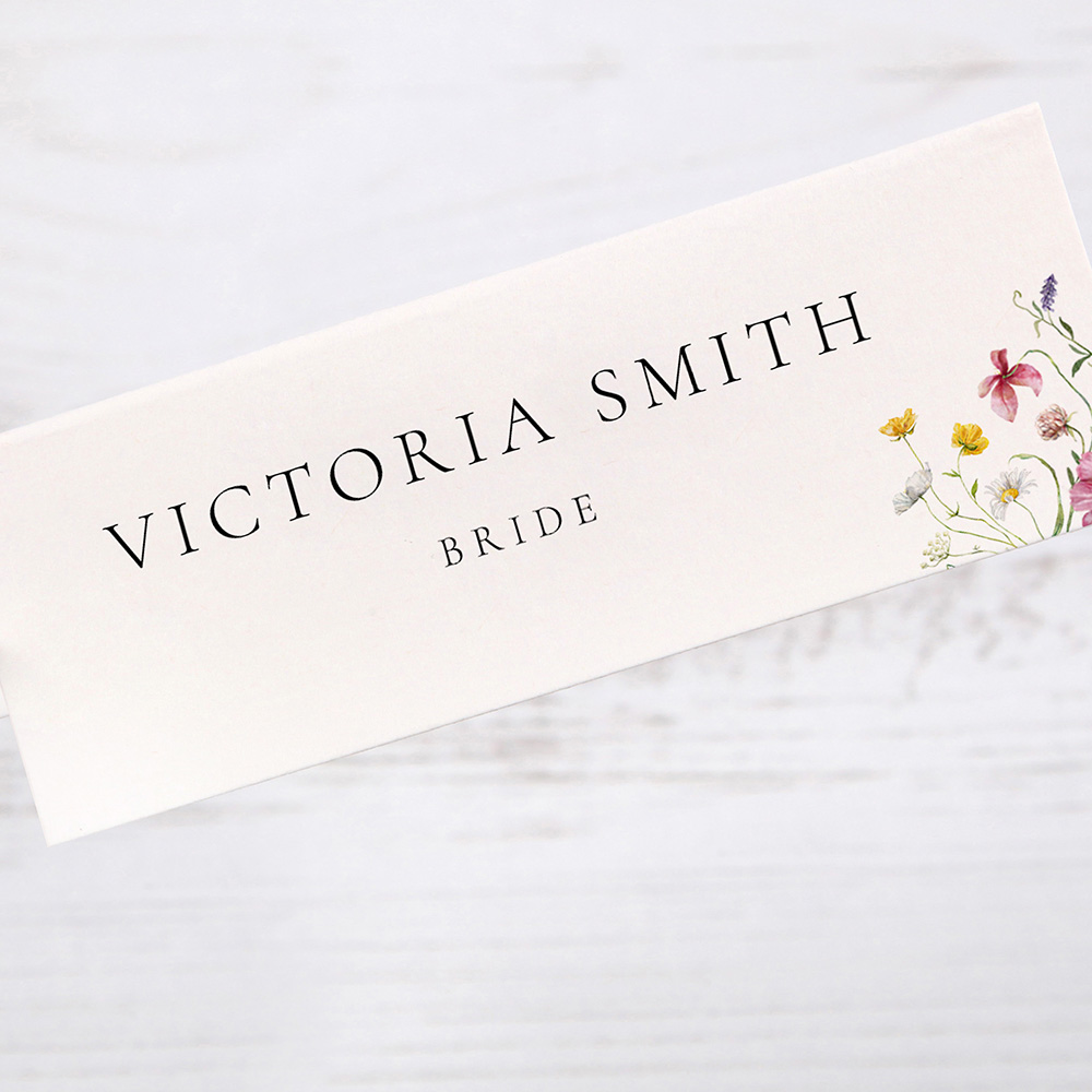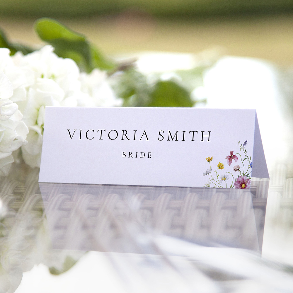 Our Sweet Serenade place cards bring a delicate scattering of wildflowers together with classic serif typography, making them perfect as wedding place cards for an elegant reception. These personalised name cards add a finishing touch to your table setting and are available on a choice of luxury cardstock.
