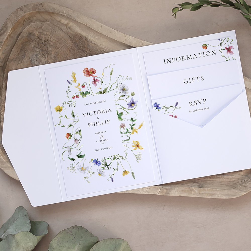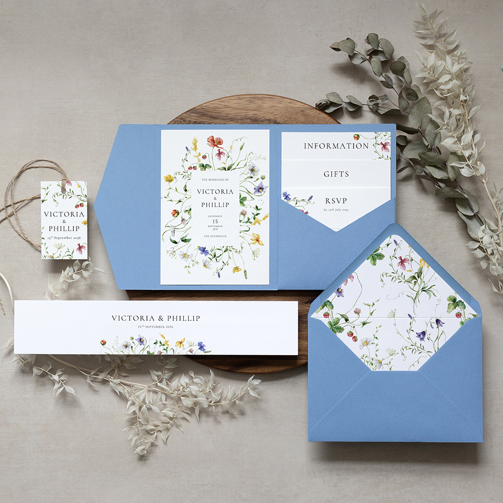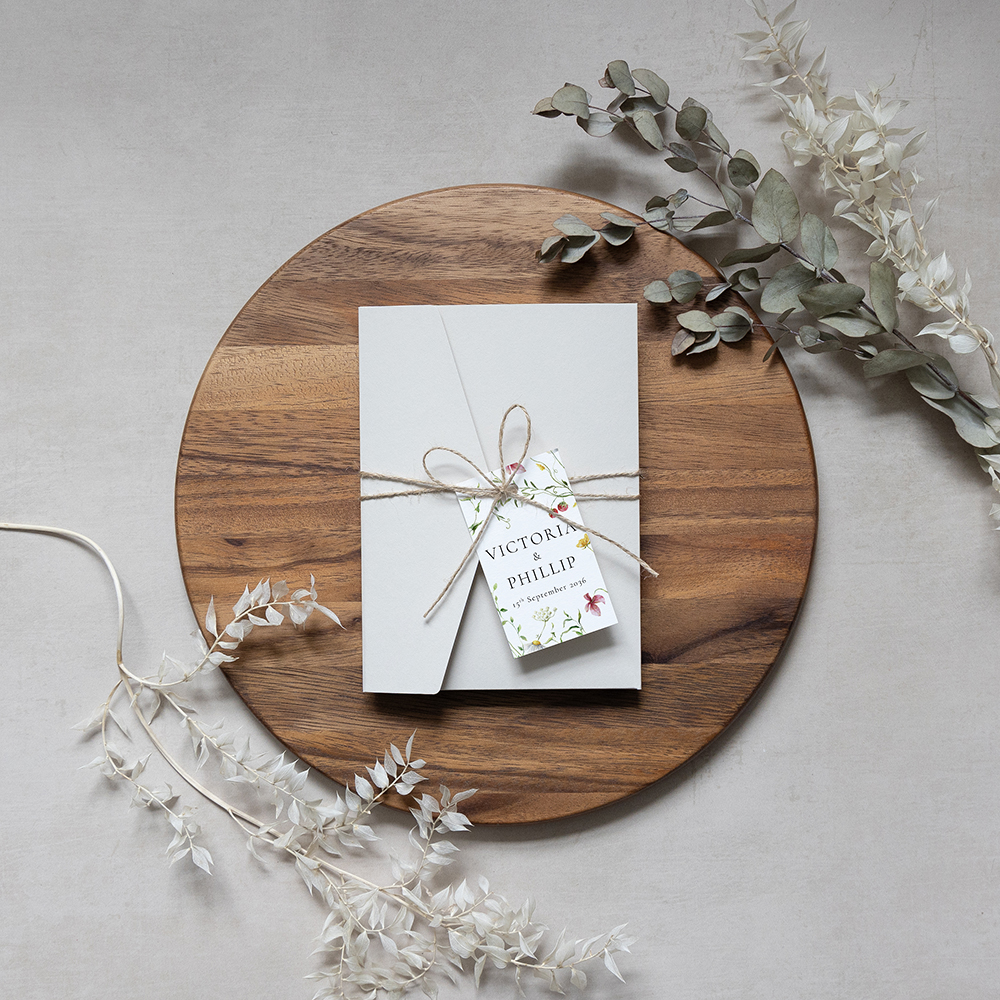 Order a sample of our customised wedding invitations tucked into a pocketfold with optional additional cards.  Envelopes are included. These invites are printed on thick 330gsm smooth white or ivory cardstock or on our Premium 350gsm Cream lightly textured card. Choose a matching tag and twine to tie around the finished set or opt for a matching sleeve with sticker instead. Button magnets, matching Envelope Liners, and Envelope Stickers also available.